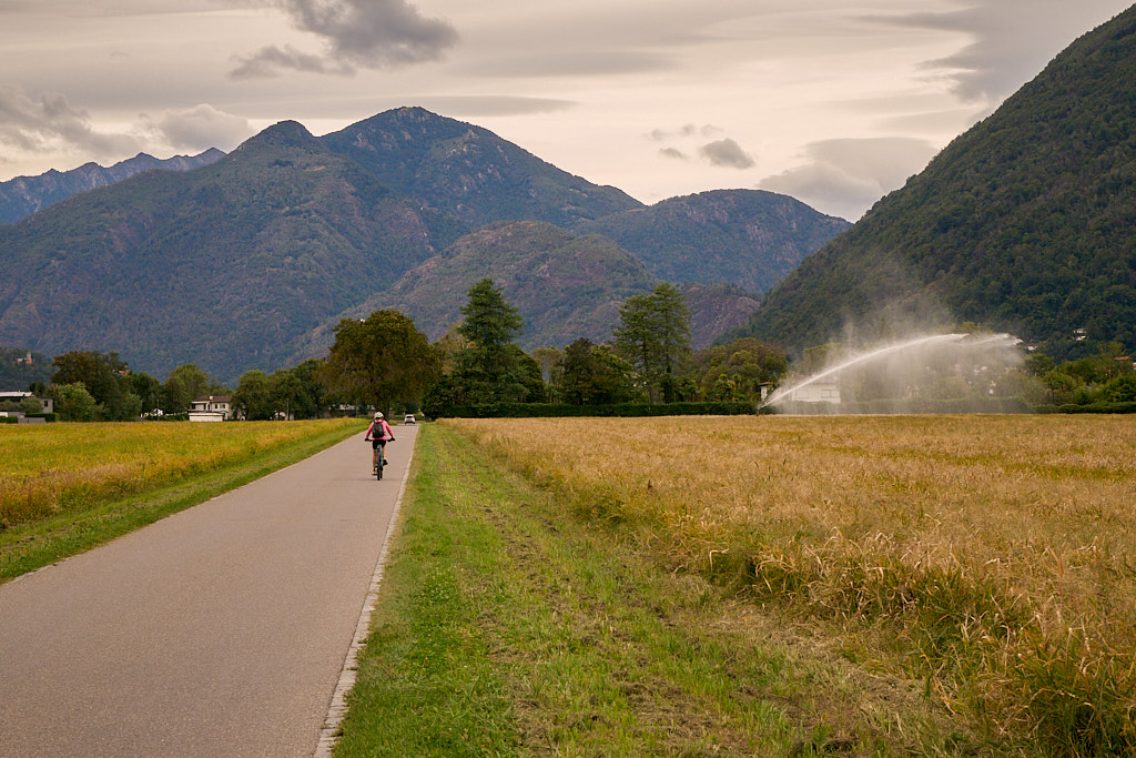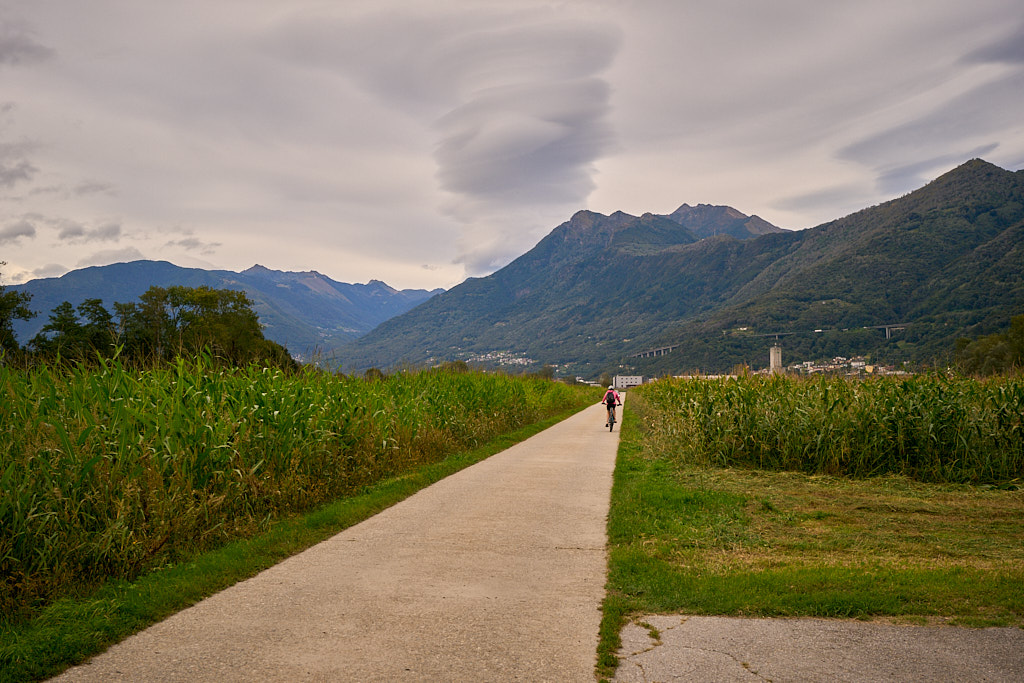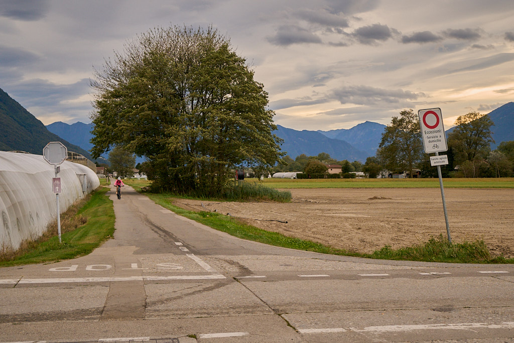 Nachdem wir nun alle Pflichtziele der heutigen Tour erreicht hatten, blieb nur noch der lange Rückweg nach Bellinzona. Wir fuhren zunächst auf einer anderen Route zurück zur Uferpromenade, dem „Lido“ von Locarno. Am schönen Strandbad, auf dessen Liegewiese ich in einem früheren Leben auch schon sass, fuhren wir mehrere Kilometer auf einem sehr schönen Spazier- und Radweg dem Ufer des Lago Maggiore entlang nach Minusio und Tenero, bis wir bei Gordola wieder unseren Hinweg erreichten. Bei Magadino verliessen wir ihn aber wieder, um im Süden über Cadenazzo zurück nach Hause zu fahren. Auch wenn der Radweg grösstenteils über Feldwege und am Rand von Industriegebieten führte, mussten wir doch zahlreichen Autos ausweichen, die den Feierabendverkehr auf den Hauptverkehrsachsen kreativ im Gelände zu umgehen versuchten. Bei Dämmerung und im bereits schon sehr kühlen Abendwind erreichten wir wieder unser Basislager und machten uns nach dieser ausgiebigen Rundreise sogleich ans Essen.