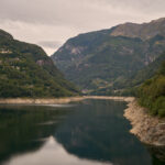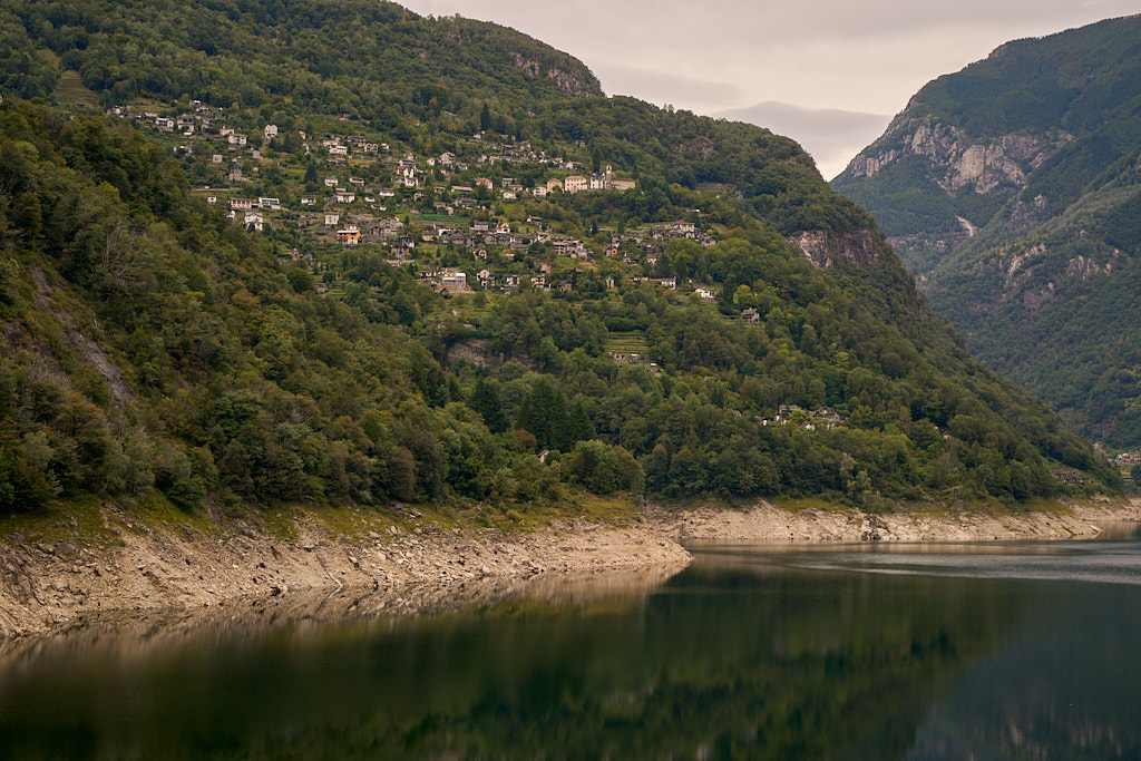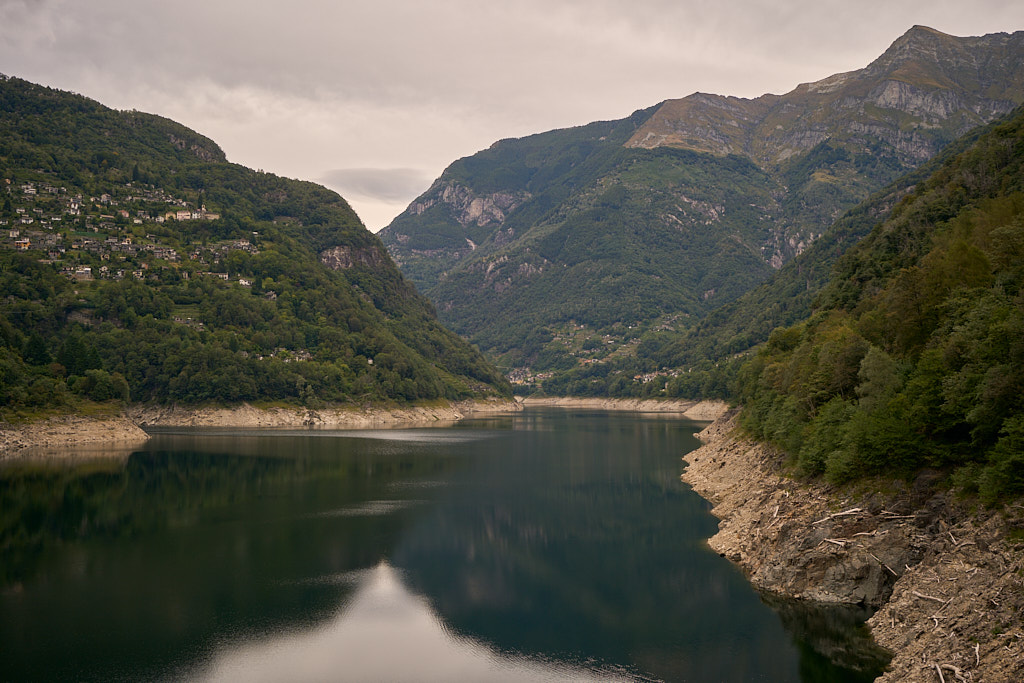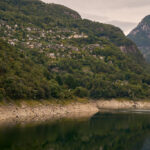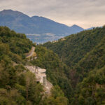 Vom Stadtzentrum gelangten wir auf langen und schönen Radwegen abseits vom Verkehr durch den Piano di Magadino nach Gordola am Eingang der Verzascaschlucht. Hier begann der Aufstieg zum Lago di Vogorno und seiner Staumauer. Vor vielen Jahren hatte ich einmal einen Urlaub in Lavertezzo im Verzascatal verbracht, konnte mich aber trotzdem überhaupt nicht mehr an die Strasse und die Fahrt ins Tal erinnern. Die 300 Höhenmeter vom Aufstieg währten nicht allzu lange und bald schon konnten wir die gewaltige, 220 Meter hohe Staumauer von der Strasse aus sehen.