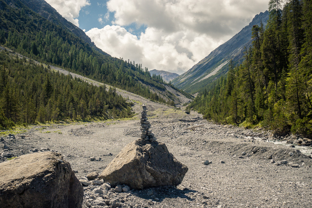 Vom Bahnhof Arosa zum Untersee und weiter an der Kläranlage vorbei nach Isel. Ein Weg führt den breiten Geröllflächen des Welschtobelbachs entlang ins Welschtobel hinein. Wir folgen den Wegweisern in Richtung Kleinem und Grossem Wasserfall.