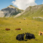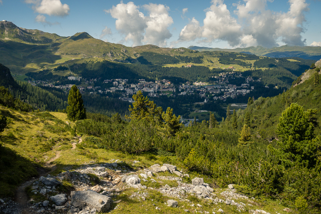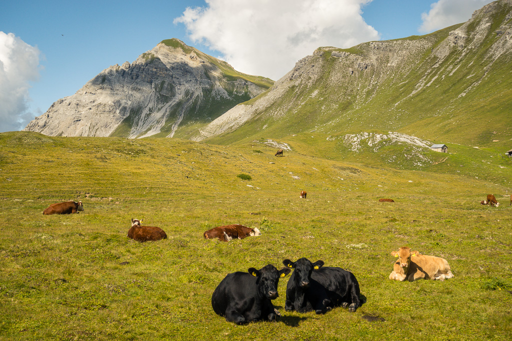 Im Abstieg zunächst auf dem Aufstiegsweg zu einem Wegweiser etwas unterhalb des Gipfels. Hier zweigt der Weg in das Hochtal von Gargelun in Richtung Alp Martrüel ab. Über die weiten Weideflächen erreichen wir die Alp. Von hier aus entweder weiter über die Wiesner Alp nach Davos-Wiesen, oder am Hubel vorbei über Afiein und die Schmittner Alp hinunter nach Schmitten.