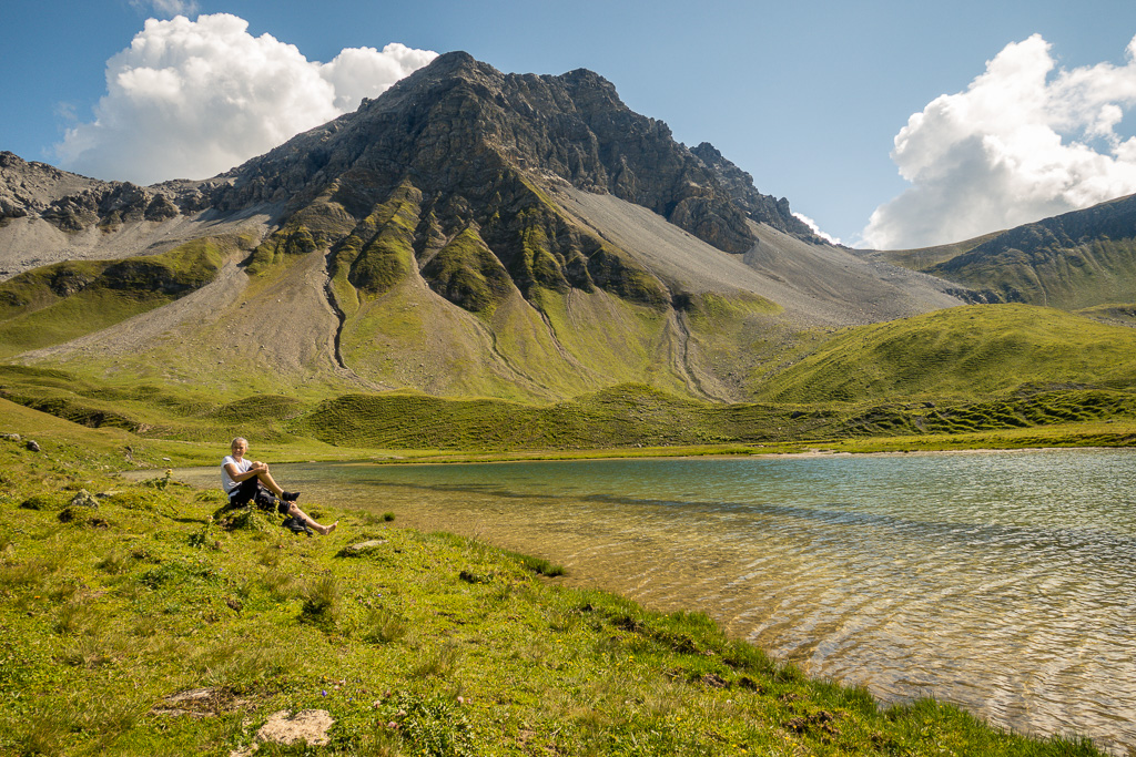 Am See vorbei über einen Steg aus Steinplatten in Richtung Valbellafurgga. Diese ist schon von weitem sichtbar und wird zunächst über sumpfige Weideflächen und später steil aufsteigend durch das Jammertälli über gerölldurchsetzte Grashänge in einem ausholenden Bogen erreicht.