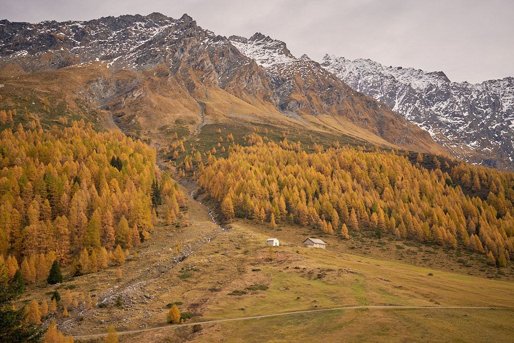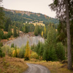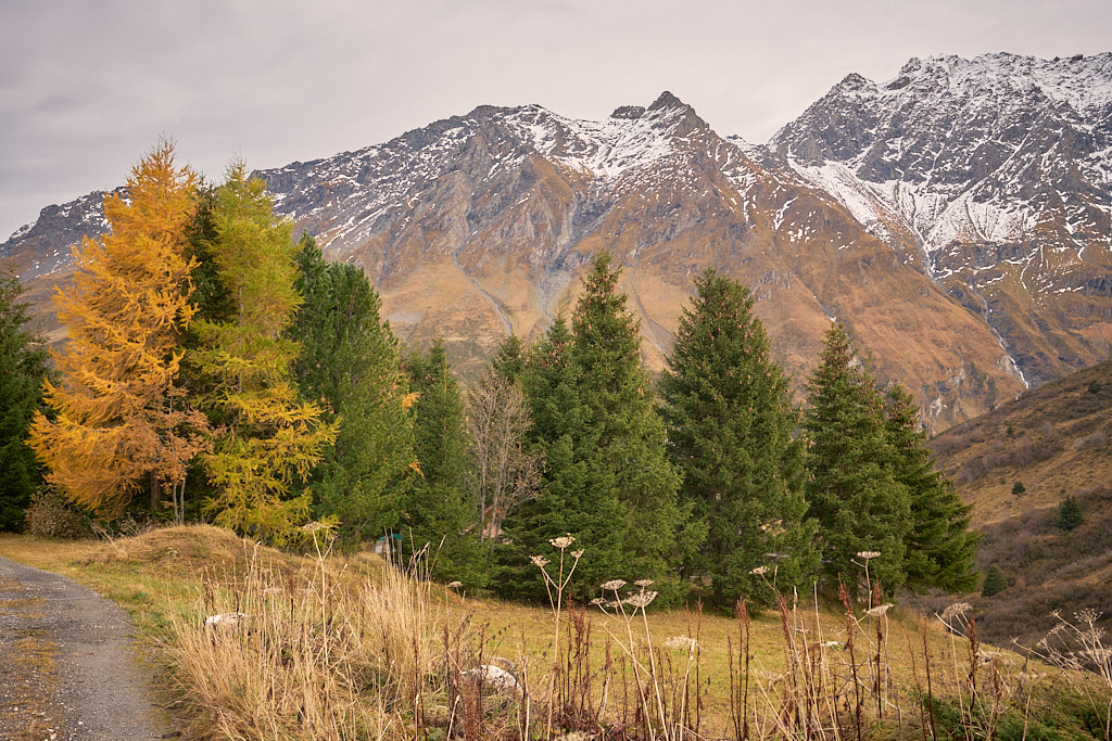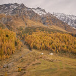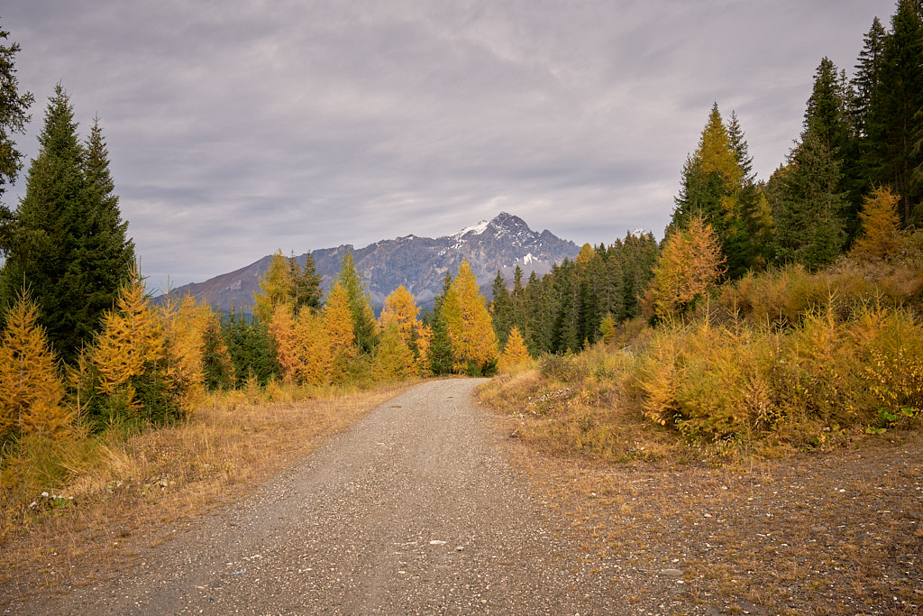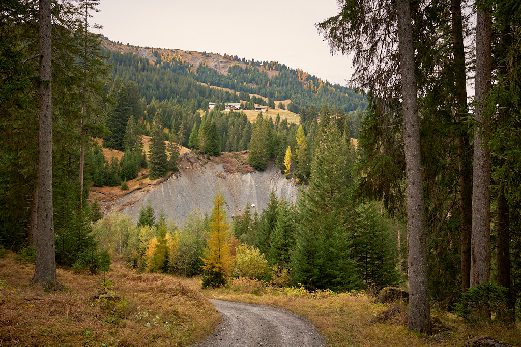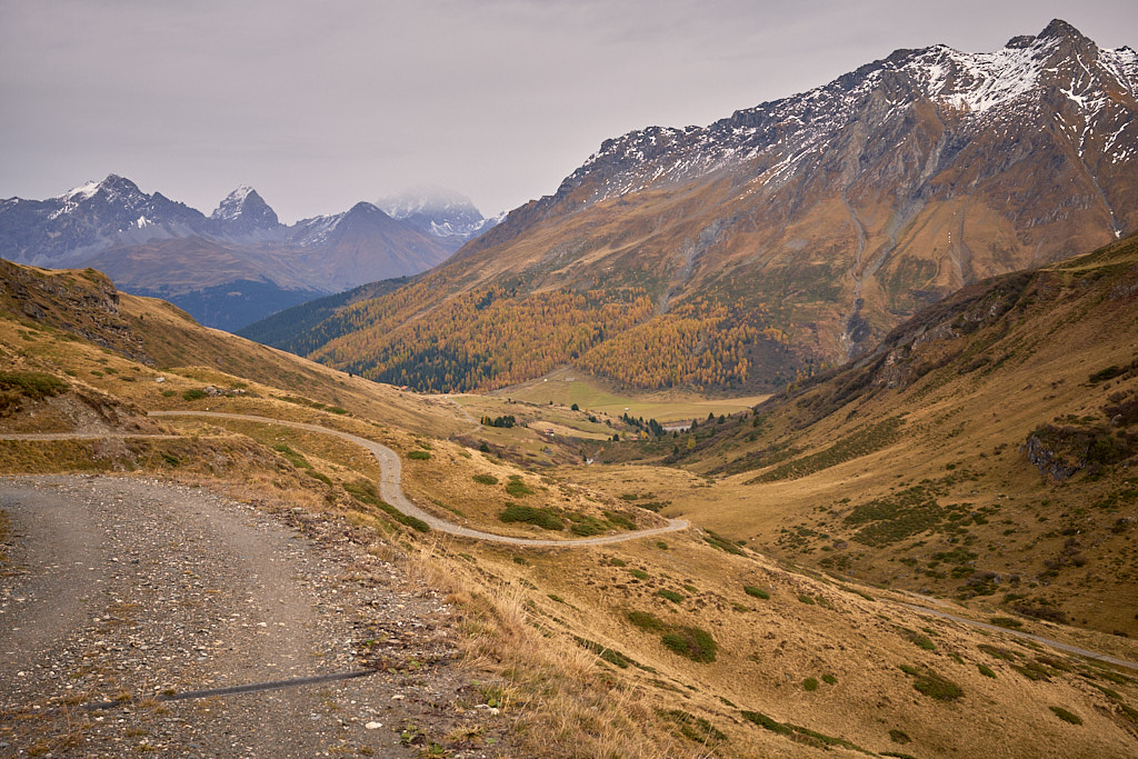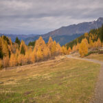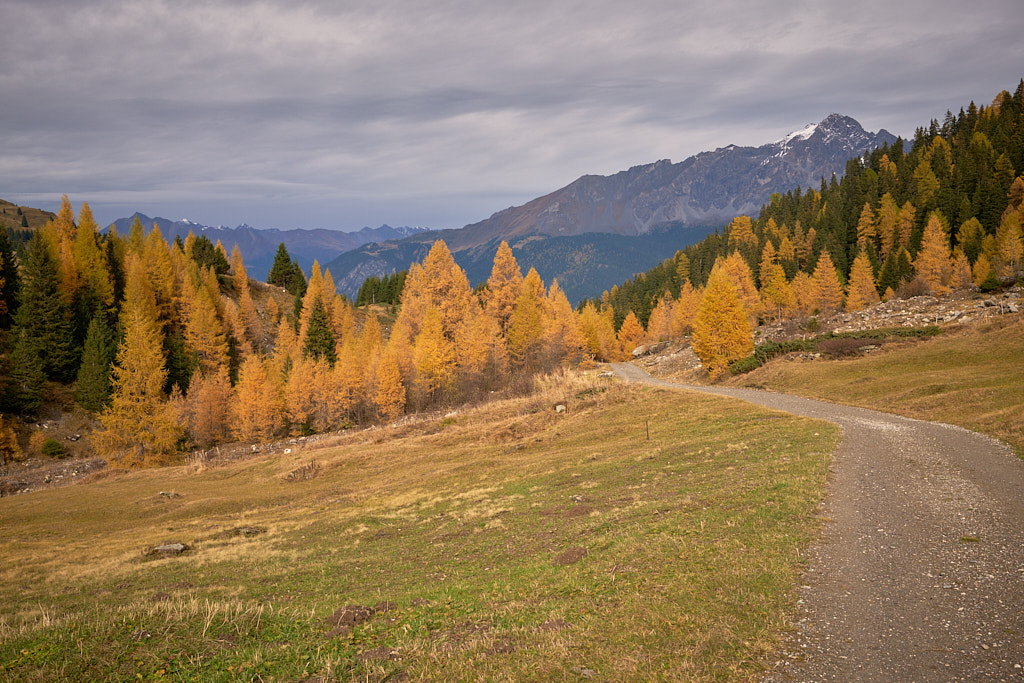 Die Abfahrt war ein rasantes Vergnügen zunächst auf dem Alpweg nach Radons, dann über die weite Hochebene des Val Curtegns und schliesslich durch herrlich gelb leuchtende Lärchenwälder nach Savognin. Hier folgte ich der markierten Mountainbikeabfahrt, was angesichts der Nässe bis zum Dorf in eine ziemliche Schlammschlacht ausartete. Die paar erschreckten Wanderer im unteren Teil schienen mich jedenfalls bereits für einen Waldschrat zu halten.