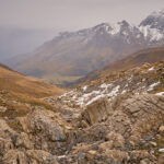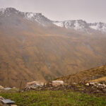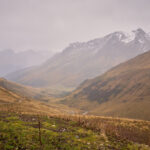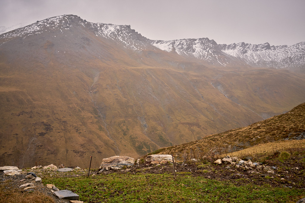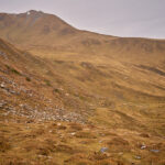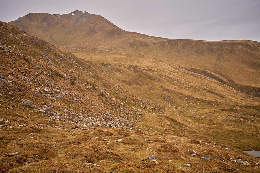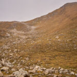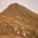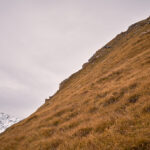 Mit zunehmender Höhe wurde das Gelände immer steiler. Als die nassen Graspolster anfingen, beim Gehen meine Oberschenkel zu streifen, hielt ich inne und schaute etwas beunruhigt in die Tiefe. Das Gras war aber gut gestuft mit ständigen Absätzen und Tritten, zudem konnte ich nicht mehr weit vom höchsten Punkt entfernt sein. Tatsächlich nahm die Hangneigung wenig später deutlich ab und ein Steinmann tauchte auf dem höchsten Punkt auf.