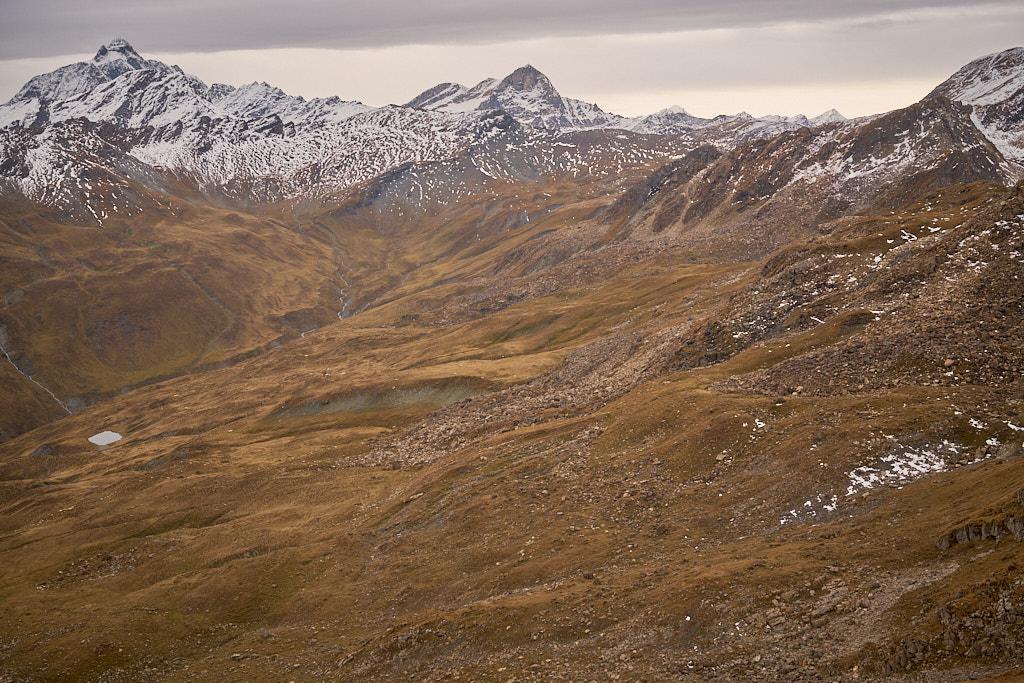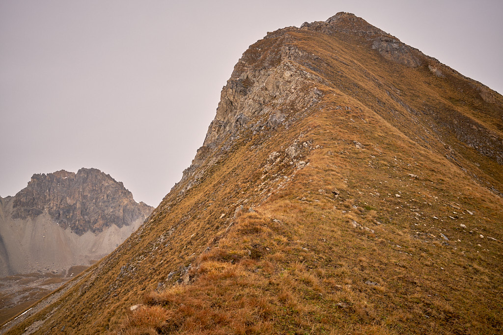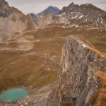 Ich stieg noch ein paar Schritte zum Nordgrat weiter. Dieser schien wie beschrieben tatsächlich sehr exponiert zu sein. Der Berg brach auf der linken Seite vom Grat in eine senkrechte Felswand ab. Dahinter war der Pas da Schmorras zu erkennen sowie ein unbenannter, malerisch türkisblauer kleiner Bergsee. Nach Süden konnte man hingegen den ganzen Südgrat bis zum Sattel bei P.2569 einsehen und ich beschloss, über diese im Aufstieg verschmähte Route abzusteigen.