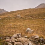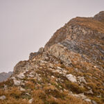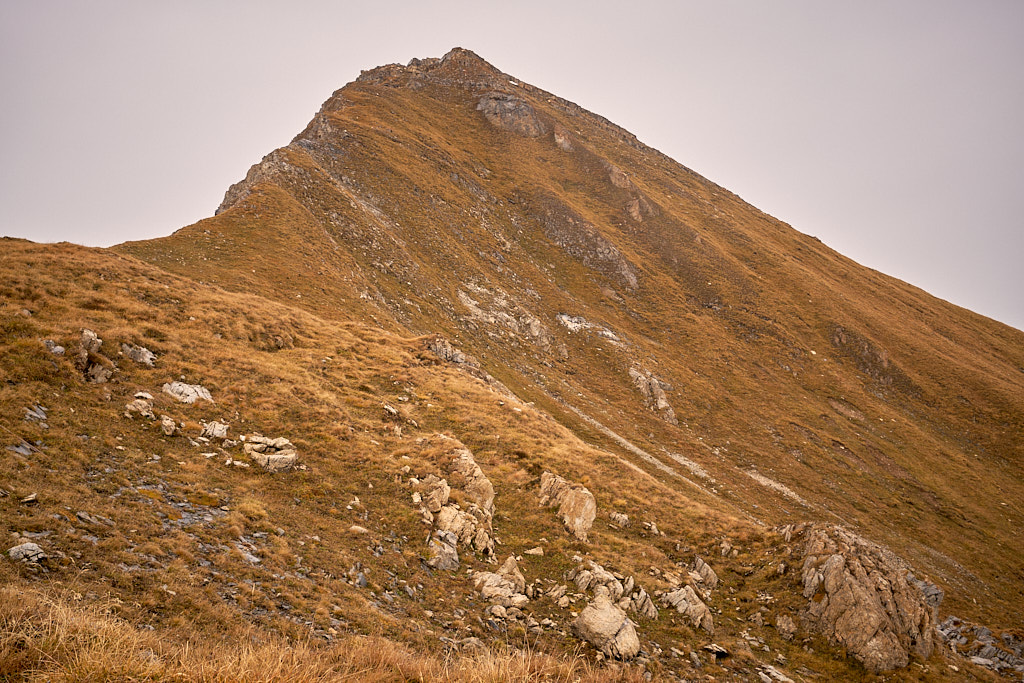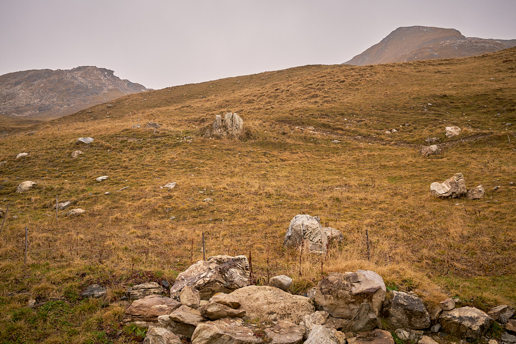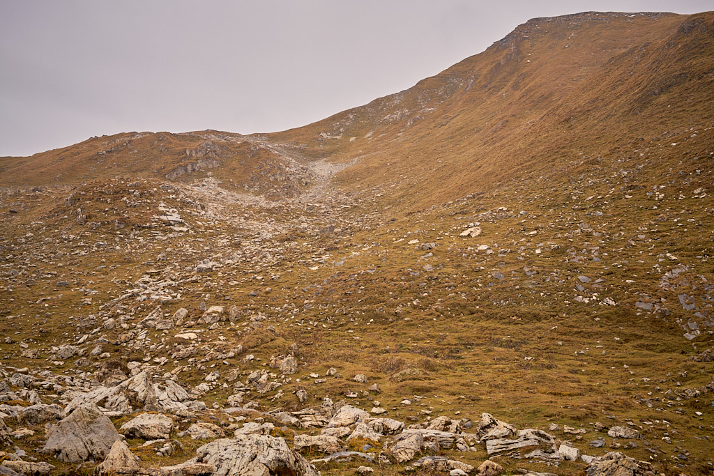 Ich stieg also von der Alp Schmorra zunächst nach Westen in der Falllinie die Grashänge empor. An einem Plateau bei P.2393 vorbei steuerte ich den tiefsten Punkt des Südgrats an (P.2569). Das Gras war trotz Nässe erstaunlich gut zu begehen (oder hatte ich diesmal einfach vorahnend die besseren Schuhe angezogen als neulich am rutschigen Vilan?) Weiter oben war das Gelände allerdings mit Blockgeröll durchsetzt, was mir auf Dauer etwas mühsam vorkam. Ich wich deshalb bald einmal nach rechts aus, um im Gras zu bleiben und stieg in der Südostflanke des Piz Settember in Richtung Gipfel.