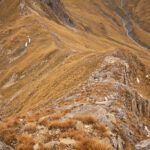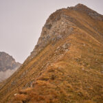 Der Südgrat war im oberen Teil mit mehreren kleinen Felsabsätzen und -aufschwüngen sowie mit losem Geröll und herumliegenden nassen Steinplatten durchsetzt. Ich stieg entweder direkt auf dem Grat ab oder umging die Felsen links auf guten Absätzen im steilen Grashang. Wegspuren waren stellenweise erkennbar, die Route war aber allgemein weglos. Bald hatte ich den felsigen Gipfelbereich hinter mich gelassen, der Südgrat wurde etwas breiter und flacher. Kurz vor dem Sattel bog ich nach links ins Geröllfeld ab, das ich beim Aufstieg gemieden hatte. An dessen unterem Auslauf kam ich wieder auf meinen Aufstiegsweg zurück und folgte diesem bis zur Alp Schmorras und meinem Bike.