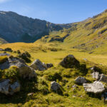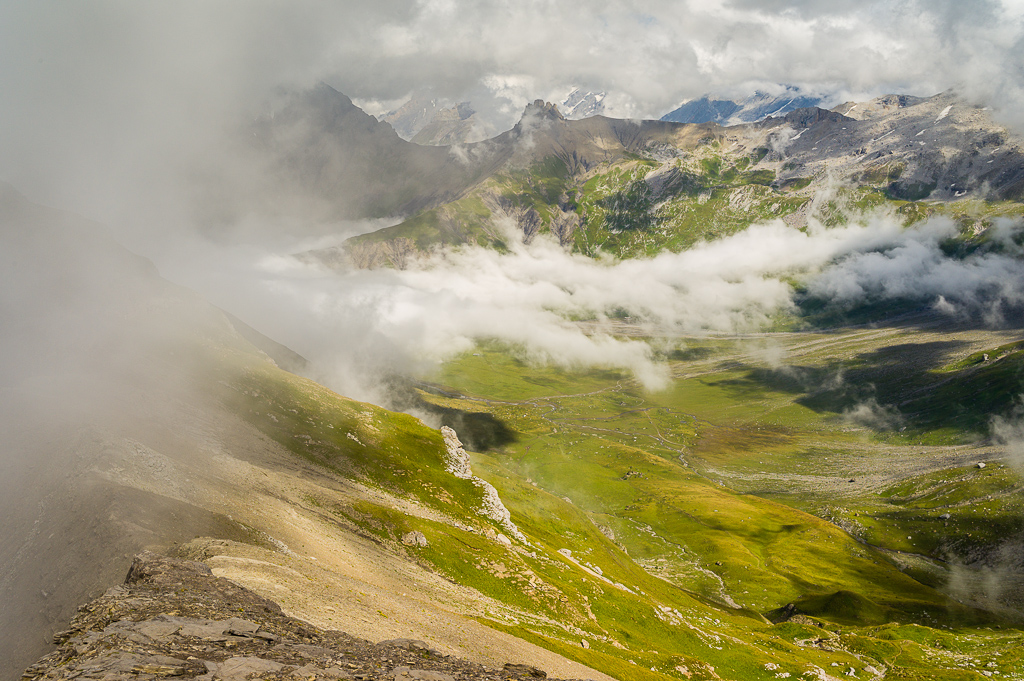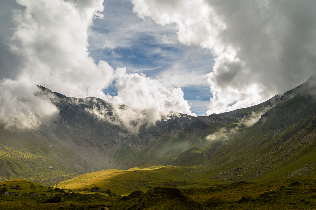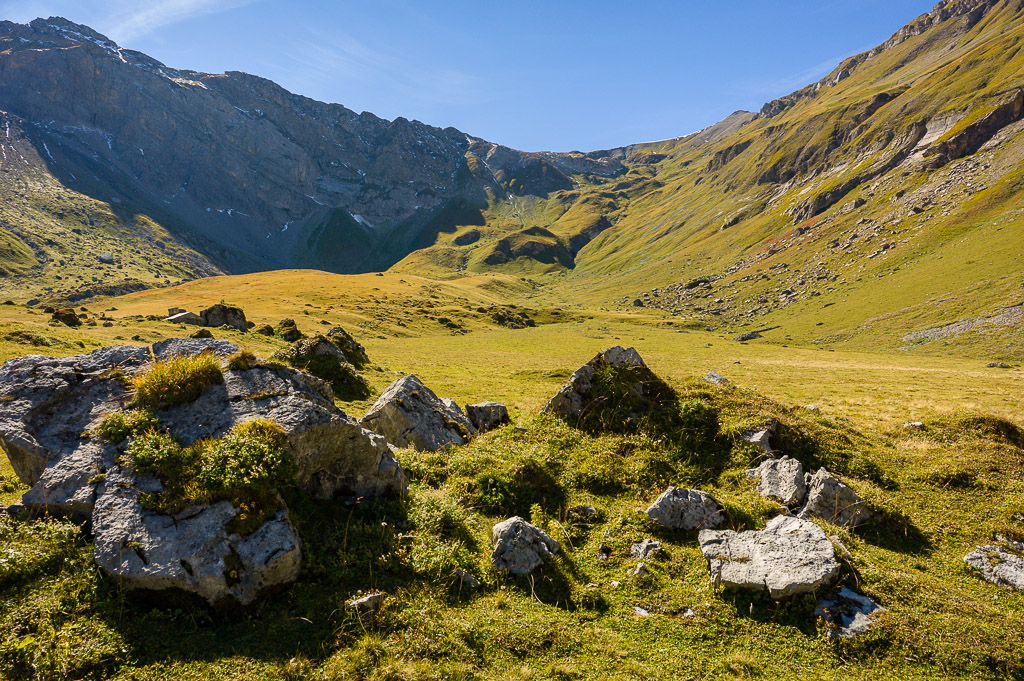 Von der Bergstation auf breitem Rundwanderweg zunächst südlich, dann südwestlich bis zur einem schmalen Steg über einen Bach am nordwestlichen Rand der weiten Alpfläche. Auf der anderen Seite des Stegs verlässt der weiß-rot markierter Weg zum Ammertepass den Rundwanderweg und steigt zunächst mäßig auf die Alpweiden von Rossfährich und Schönbüel an. Ab hier wird der Weg steiler und man erreicht schlußendlich über Geröllhänge den breiten, schuttbedeckten Ammertepass (2.443m).