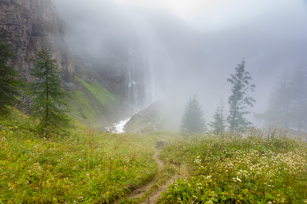 An den Gebäuden der Seilbahn Engstligenalp und dem Restaurant Bergbach vorbei auf einen Fahrweg in Richtung Engstligenalp. Etwa 100m nachdem man einen Bach auf einer Brücke überquert hat, zweigt der Saumpfad zur Engstligenalp links ab. Auf ihm zunächst durch den Wald hoch. Danach windet sich der Weg steiler und mittels zahlreicher Kehren und Holzstufen durch die steilen Felswände unterhalb der Alpfläche. Auf 1600m Höhe kommt man auf eine kleine Anhöhe in Sichtweite der Engstligen-Wasserfälle, die über einen nach rechts abzweigenden Pfad in wenigen Minuten erreicht werden können. Stattdessen dem Saumpfad nach links hinauf weiter folgen und bald über abflachende Hänge zur Bergstation der Seilbahn.