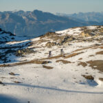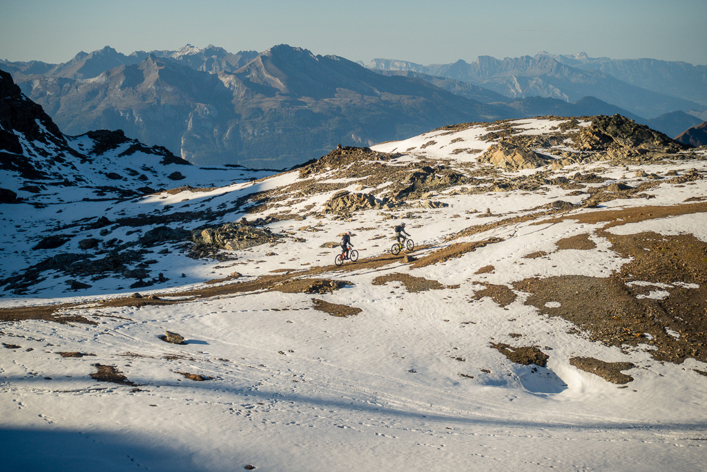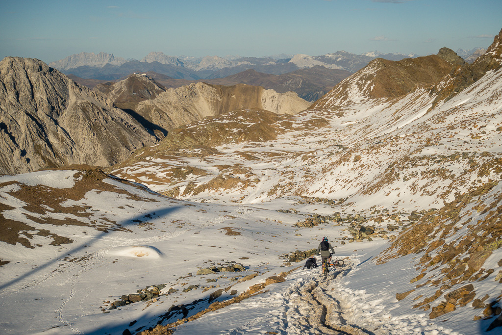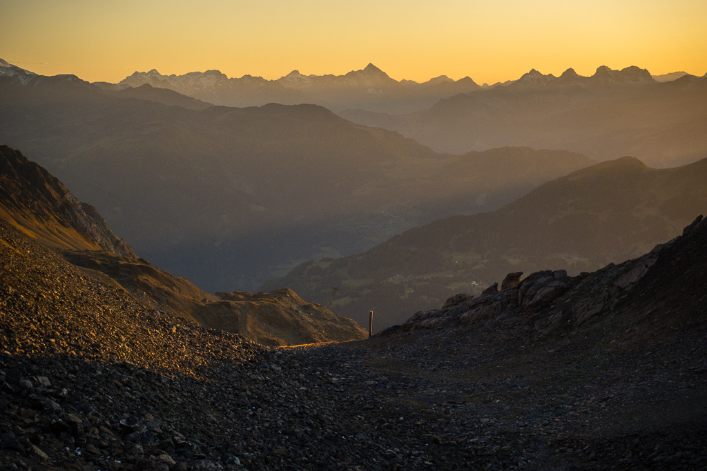 Auf dem Rückweg ab Gredigs Fürggli über Wanderwege im Skigebiet nach Motta, Alp Scharmoin und über die Fahrstrasse zur Talstation der Rothornbahn absteigen.