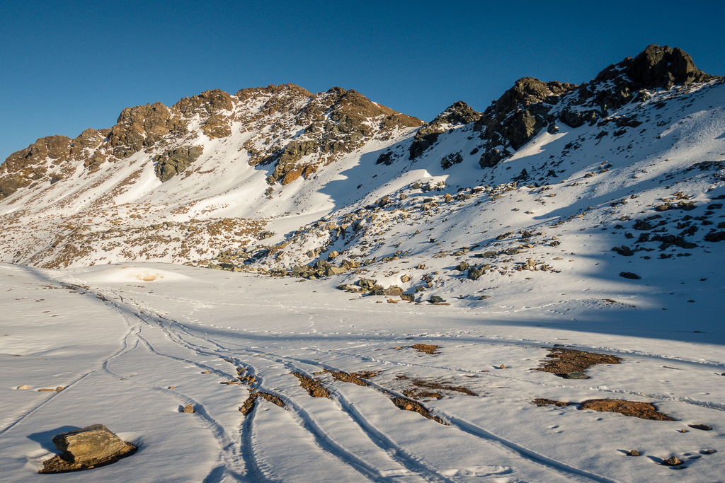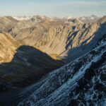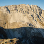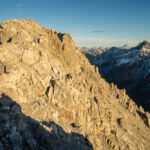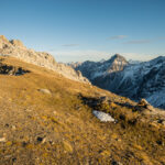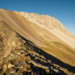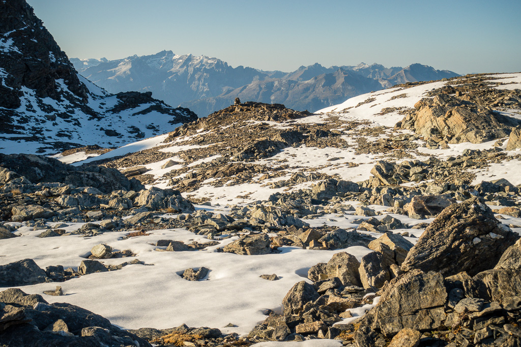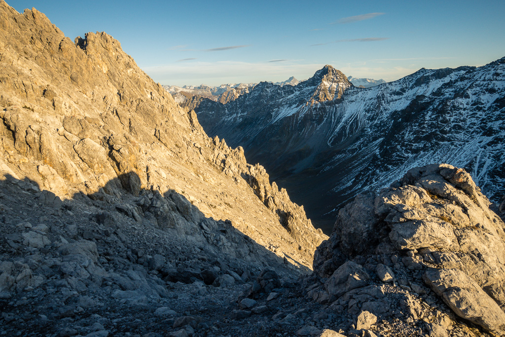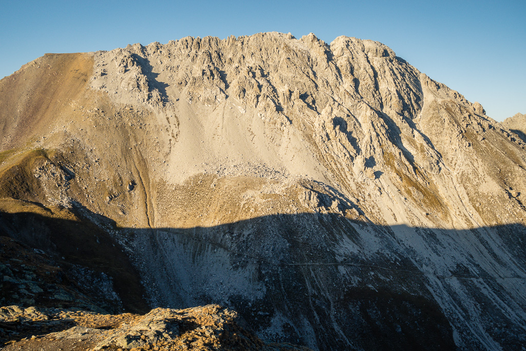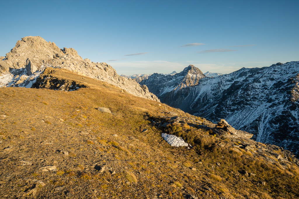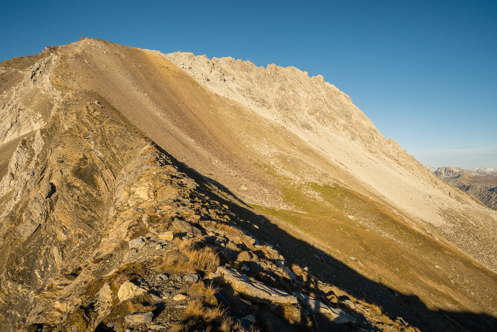 Hier beginnt der Südwestgrat des Parpaner Weisshorns. Steil, aber unschwierig hinauf zum höchsten westlichen Punkt bei P.2775, dem sogenannten Westgipfel. Von hier aus kann man zuerst über Gras, dann über den zunehmend schwierigen Felsgrat noch weiter nach Osten vordringen. Wir sind auf halbem Weg zwischen West- und Mittelgipfel (P.2822) wieder umgekehrt.
