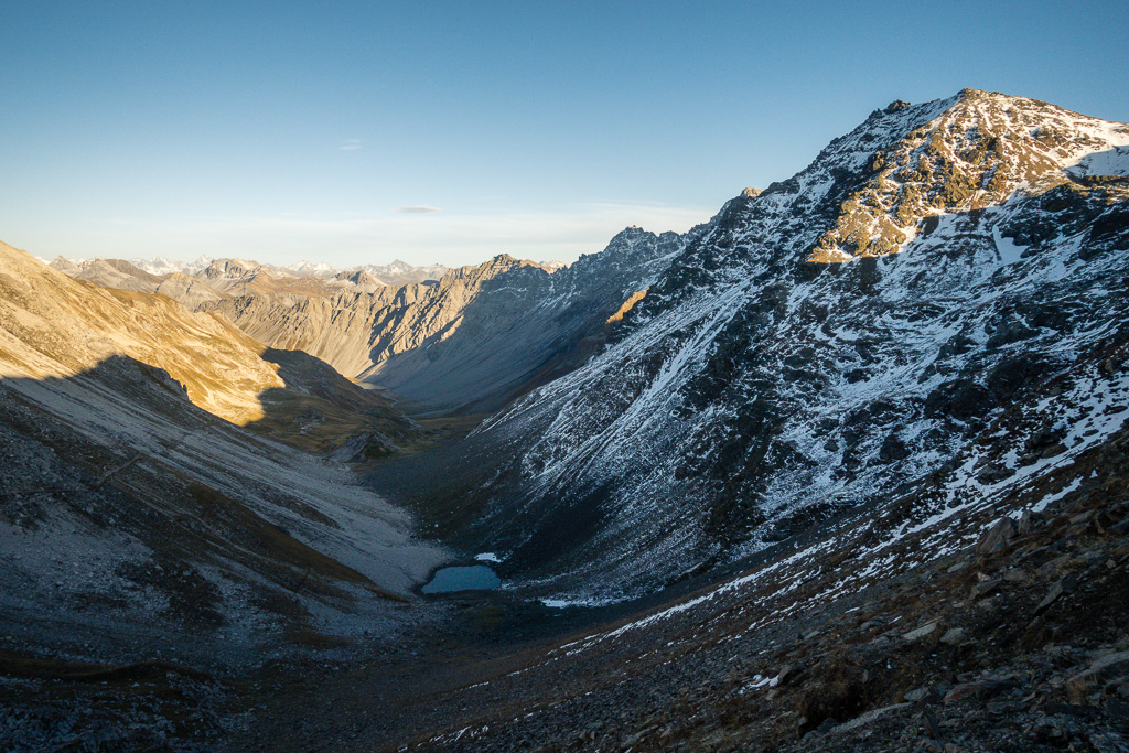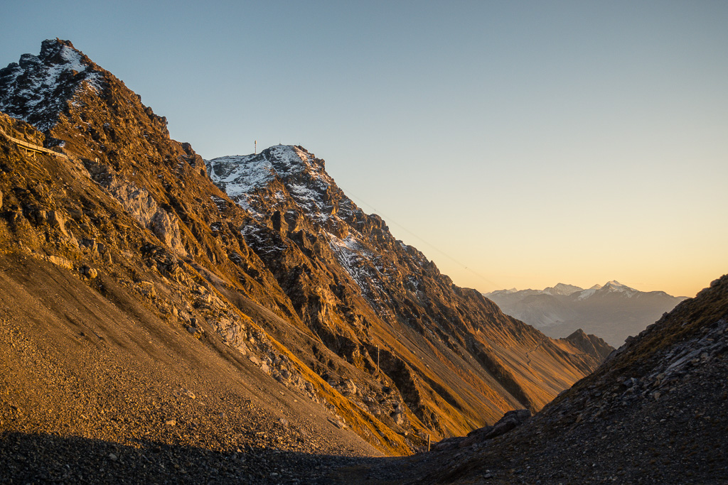 Von der Bergstation am Parpaner Rothorn auf dem Wanderweg über die Geröllfelder des Totälpli und durch eine überdachte Galerie zum Passübergang am Gredigs Fürggli.