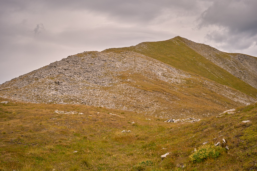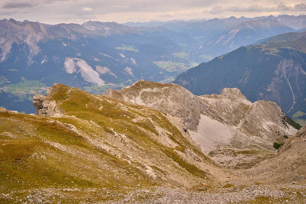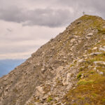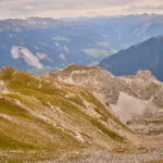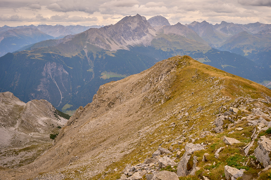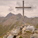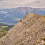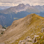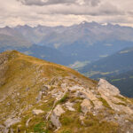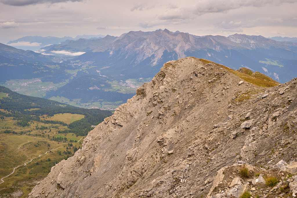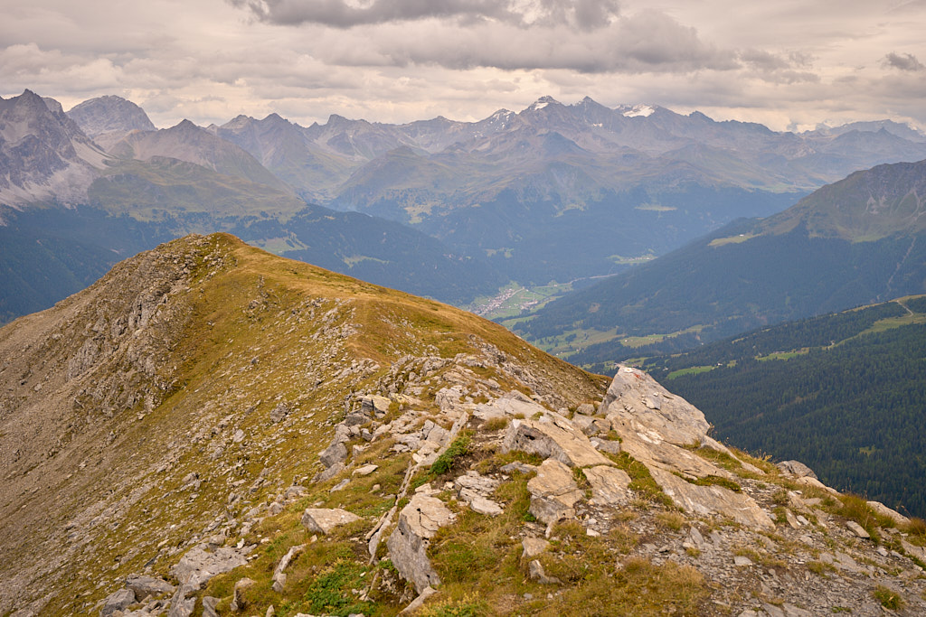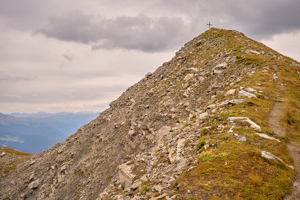 Der Weg zum Gipfel war gut sichtbar und ausgetreten. Einige verblichene rot-weisse Markierungen wiesen darauf hin, dass dies früher offenbar ein offizieller Wanderweg gewesen sein musste. Ich stieg über steiles gerölldurchsetztes Gras bis zu einem vermeintlichen höchsten Punkt hinauf, hinter dem sich ein flacher Grat dann noch weiter zum dahinter und höher liegenden Gipfelkreuz zog. Das Panorama mit Ausblicken in Richtung Lenzerheide, Savognin und den Piz Curver war beeindruckend, ebenso der Tiefblick vom Grat in die geröllbeladenen steilen Abgründe zur linken Seite. Ich wurde vom Wind ständig etwas hin- und hergestossen, erreichte das Gipfelkreuz aber schlussendlich Schritt für Schritt.