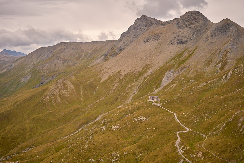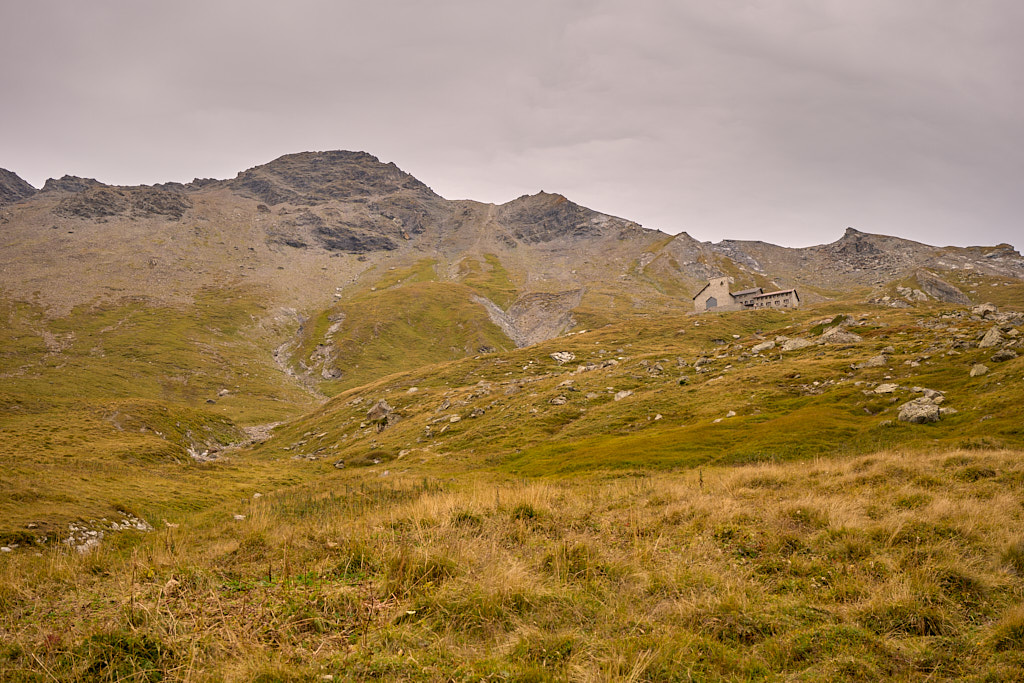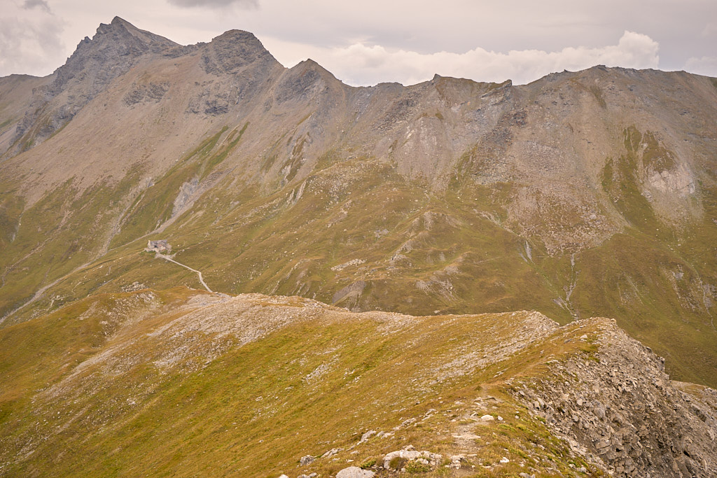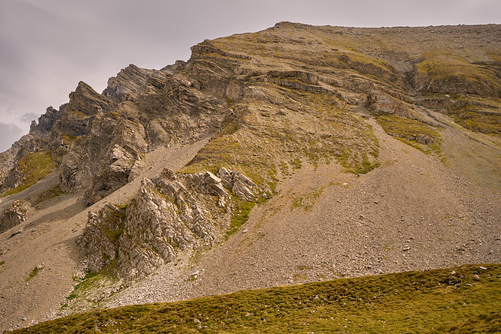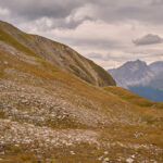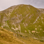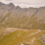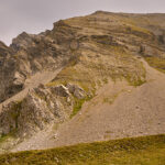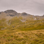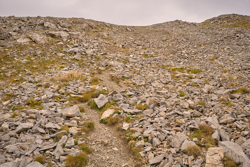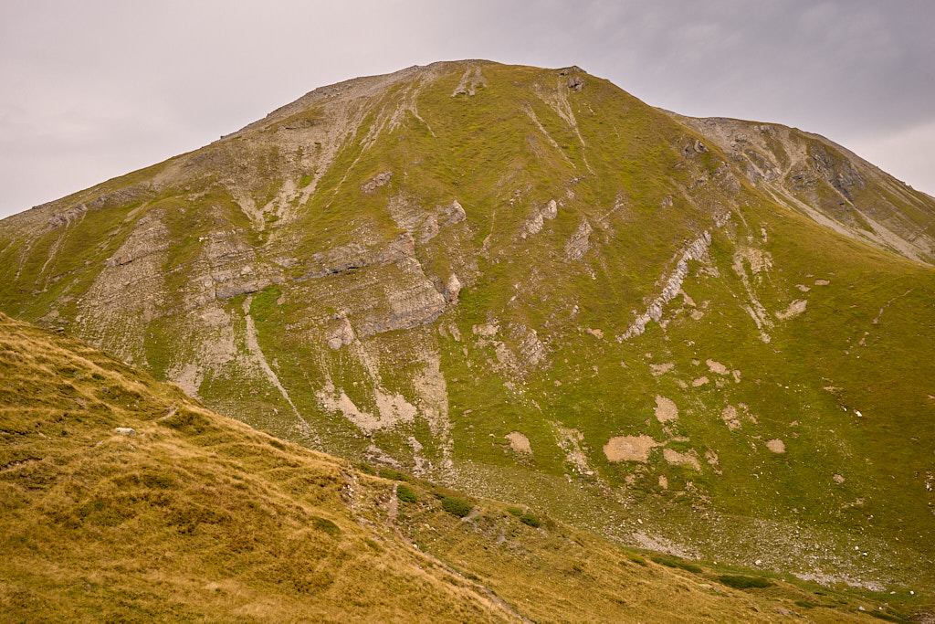 Auf der flachen Anhöhe der Furcletta angekommen, verliess ich den Weg noch vor dem letzten grossen Aufschwung zur Kirche Ziteil nach links und kam kurz darauf bei Wegspuren an, die im steilen Gras hinauf zum Piz Toissa führten. Der kalte Wind wehte nach wie vor unerbittlich stark. Ich zweifelte inzwischen sehr daran, ob der Aufstieg zum Gipfel unter diesen Bedingungen eine gute Idee sei, zumal ich von der Kleidung her mit einer leichten Reserve-Windjacke überhaupt nicht auf einen längeren Aufenthalt in derart stürmischer Kälte vorbereitet war. Am Ende beschloss ich jedoch, es zumindest mal zu versuchen, da ich nicht wissen konnte, ob und wann ich mich das nächste Mal nochmals zum Heraufkurbeln hierher motivieren würde.