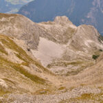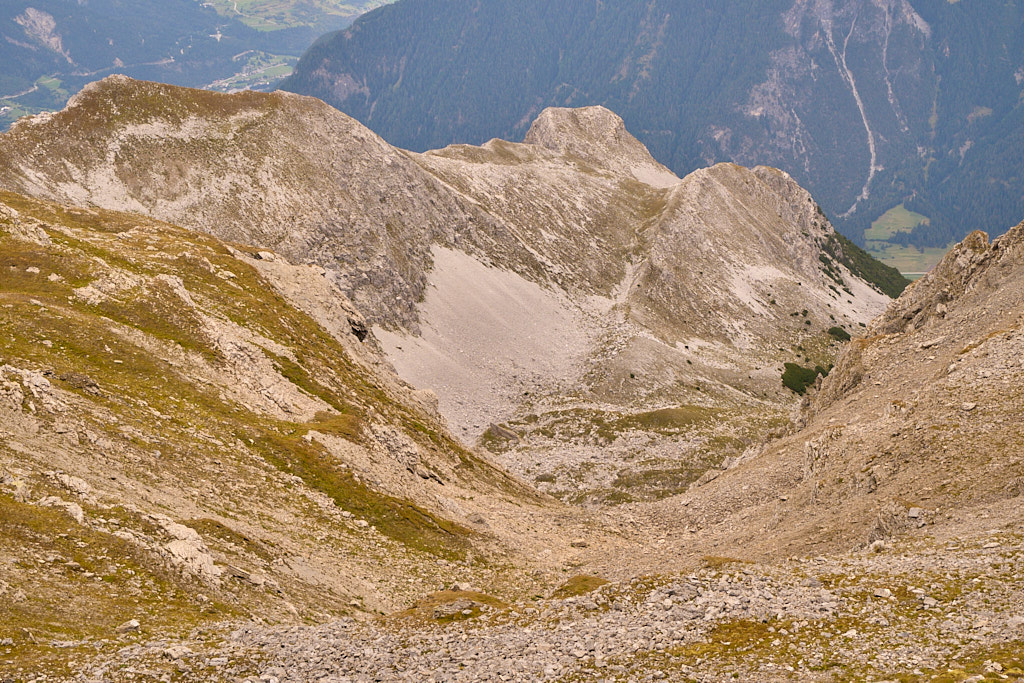 Vom Gipfel aus konnte man erstmals in den grossen, kraterartigen Kessel des Piz Toissa sehen, der auf beiden Seiten von Graten begrenzt wird und nach Osten in Richtung Salouf abfällt. Im Kessel war keinerlei Wegspuren zu sehen und überhaupt erstaunt mich, dass sich nur eine einzige Zustiegsmöglichkeit von der Furcletta aus etabliert hat. Ich hatte zwar Tourenberichte von anderen weglosen Aufstiegsversuchen von Salouf aus in den Kessel gelesen, dort musste man aber offenbar durchwegs gegen dichte Vegetation und brüchiges Gestein kämpfen.