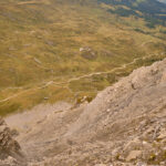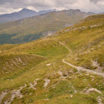Am Gipfel machte ich einige Fotos, trug mich ins Gipfelbuch ein (vor mir hatte es heute noch ein anderer Besucher bis hierher geschafft und den starken Wind erwähnt) und ging sofort zum Abstieg über. Ich machte mir dabei schon Gedanken über die Rückfahrt und ob es sinnvoll sei, den MTB-Trail auf der anderen Seite der Furcletta mit derart klammen Fingern und Gelenken hinunterzufahren. Erstaunlicherweise liess der Wind aber plötzlich immer mehr nach, je tiefer ich kam. Beim Bike auf der Furcletta angekommen, war es sogar schon fast windstill und meine Abenteuerlust erwachte aufs Neue. Zuerst musste ich den Hang auf einer holprigen Pfadspur waagrecht queren, bis ich auf den Wanderweg gelangte, der von oben von der Kirche Ziteil kam. Ab hier ging es dann auf dem bereits bekanntem Trail weiter.