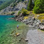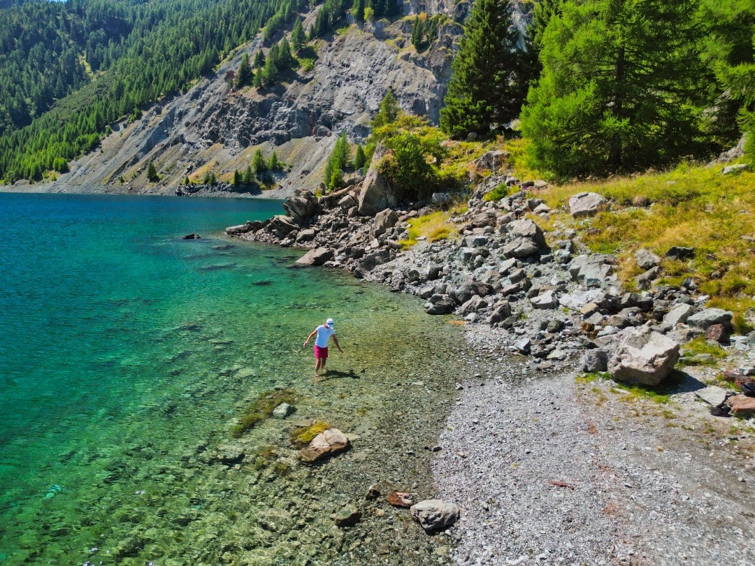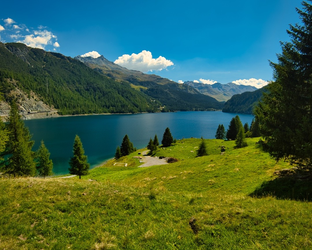 Auf dem Weg zum Julierpass ist der Marmorera-Stausee zwischen Savognin und Bivio ein praktischer Ort, um anzuhalten und ein wenig zu baden oder in der Sonne zu liegen. Man kann von der Staumauer aus aber auch eine kleine Wanderung hoch über dem See bis ans andere Ende unternehmen und von dort aus mit dem Postauto zurückfahren.