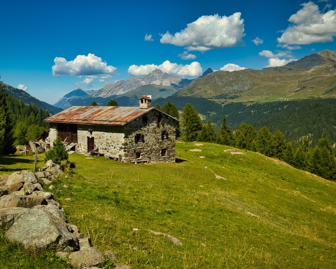 Auf der Alpstrasse bis zur Abzweigung in einer Wegkurve und über eine kleine Brücke zur Alp la Motta. Abstieg zum kleinen Weiler Sur Ragn und auf der Fahrstrasse hinunter zur Postautohaltestelle Stalveder. Von hier mit dem Postauto zurück zum Marmorera-Staudamm.