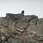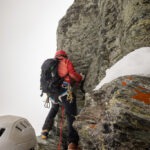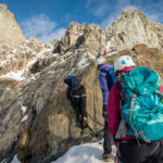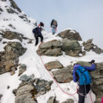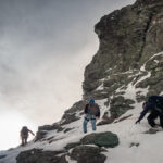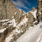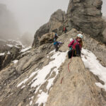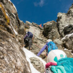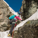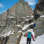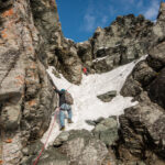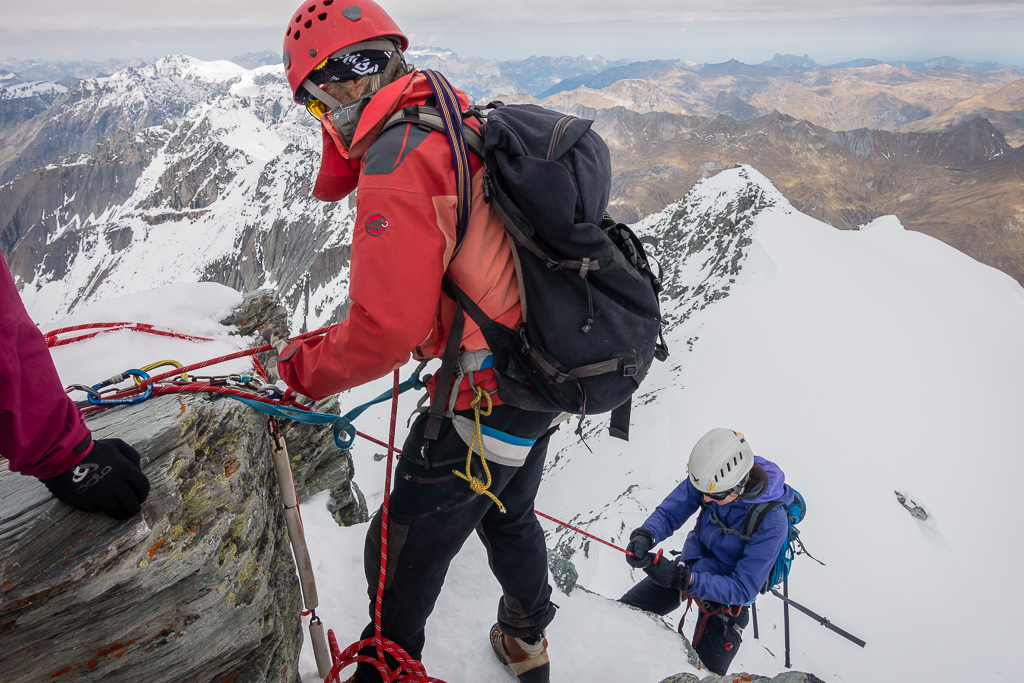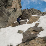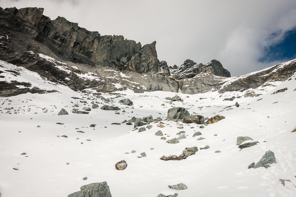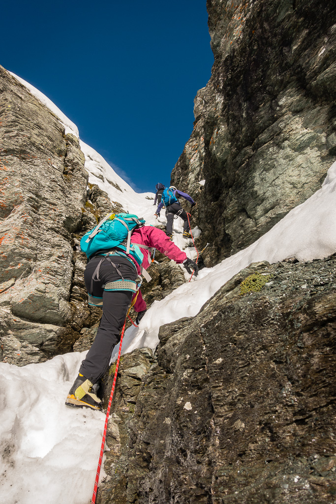 Danach geht es über einen kurzen schmalen Grat (Stand; im Abstieg kann von hier aus direkt an den Fuß der hohen Felswand abgeseilt werden) in einen kleinen, geröll- und schneebedeckten Kessel. Am oberen Ende über gut gestufte Felsen und Rinnen hinauf, wobei das Geröll und die Nässe auf den Tritten Vorsicht erfordert.