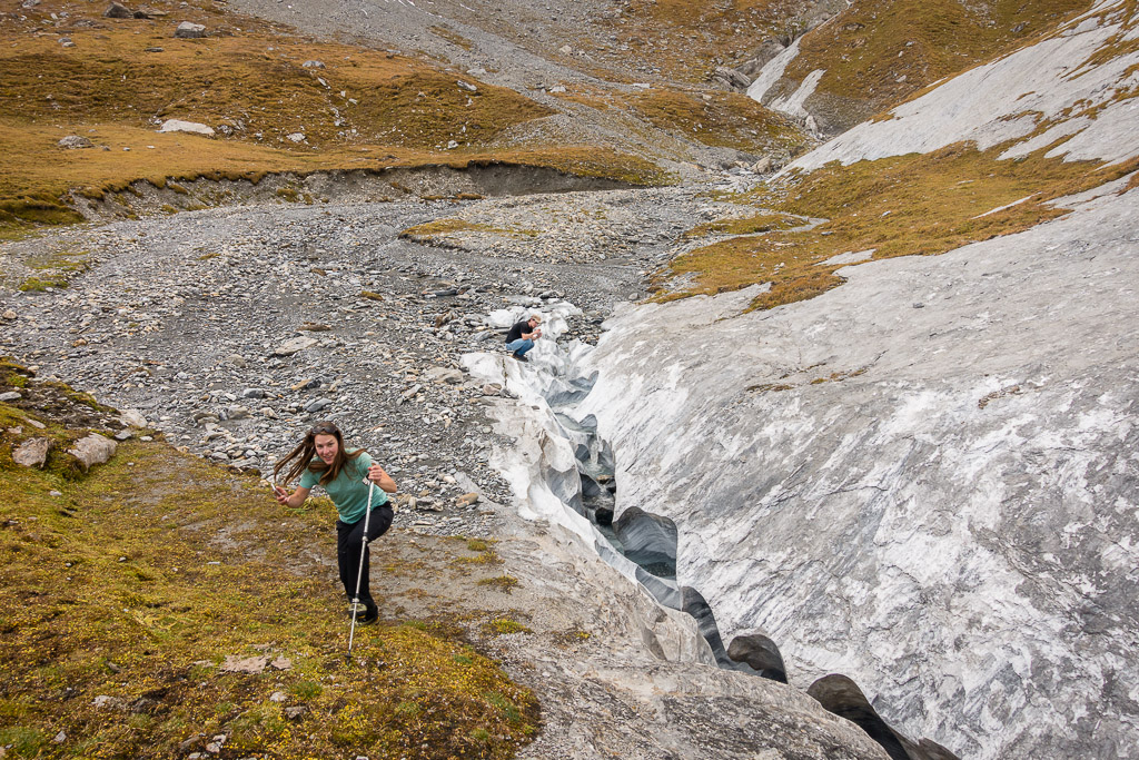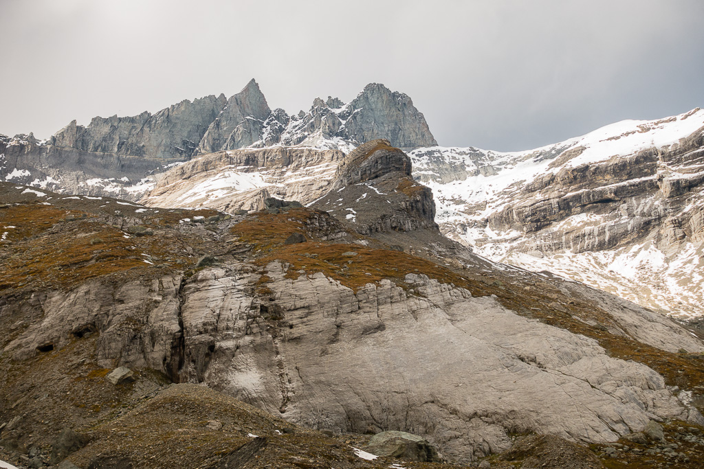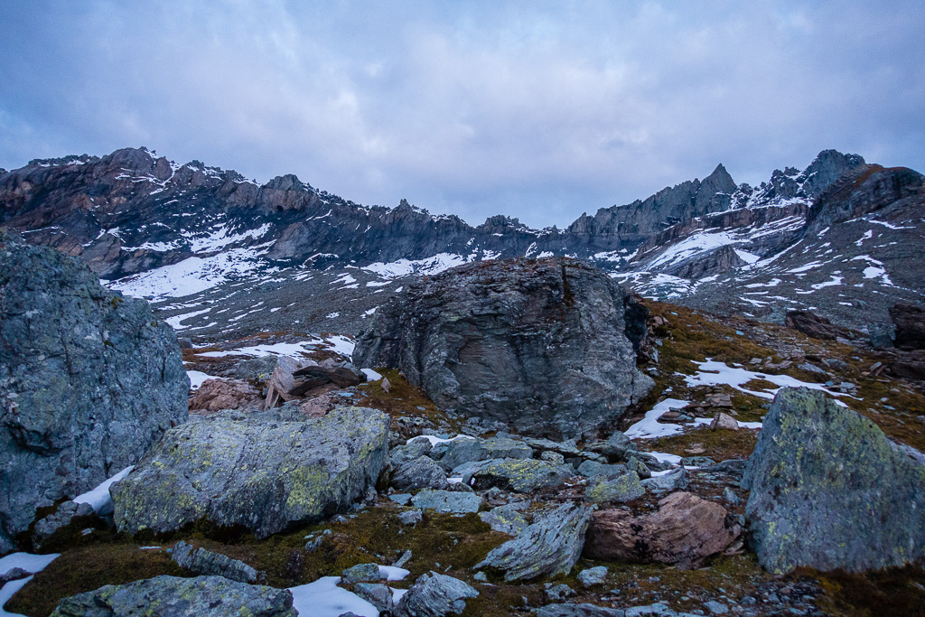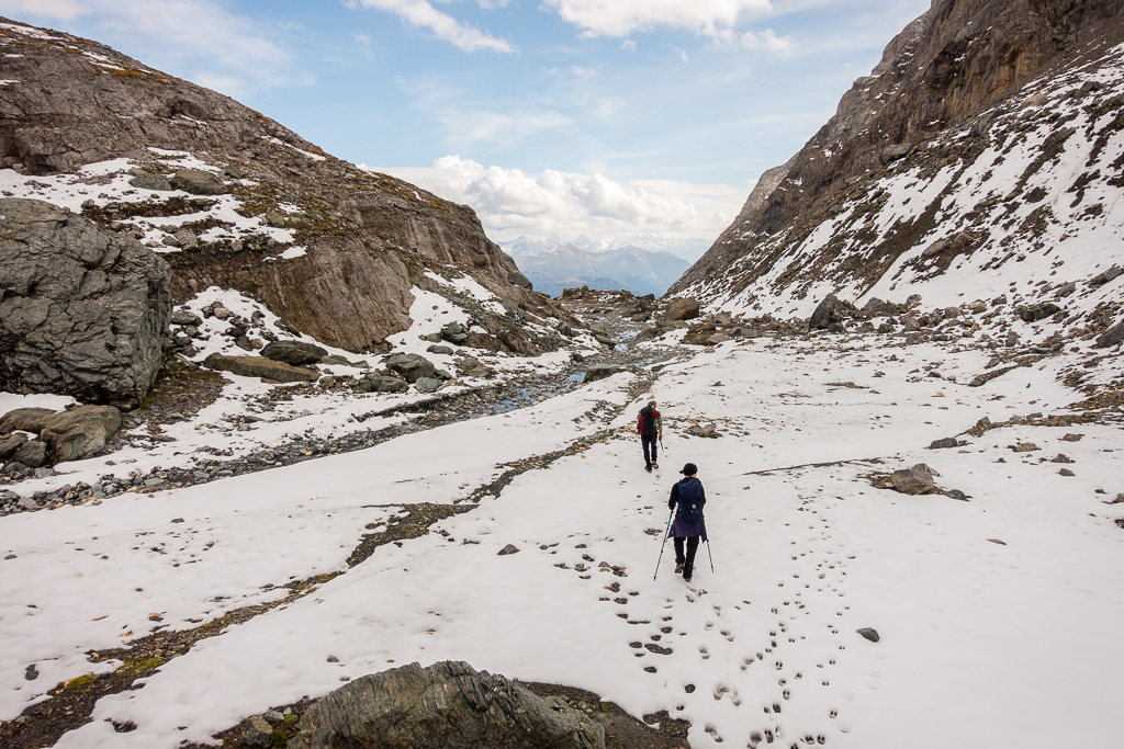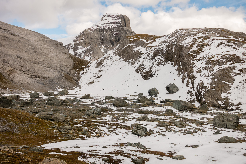 Auf 2.460m erreichten wir die Fluss- und Geröllfläche von Sandböden, auf der zahlreiche riesige Felsblöcke lagen. Diese sind vom Taminser Gletscher abgebrochen.