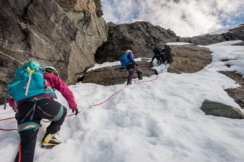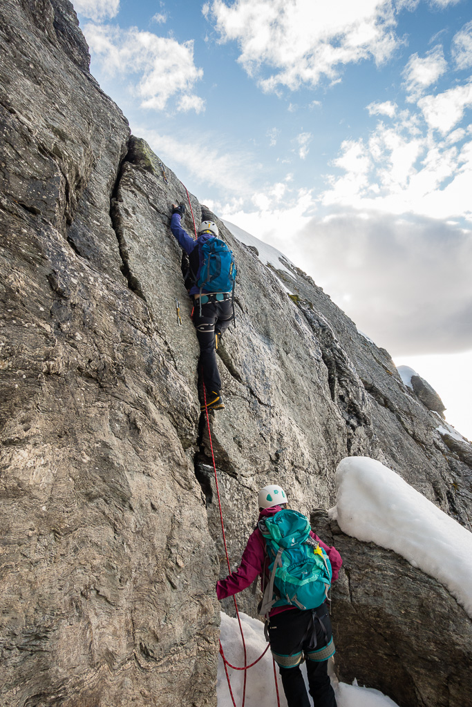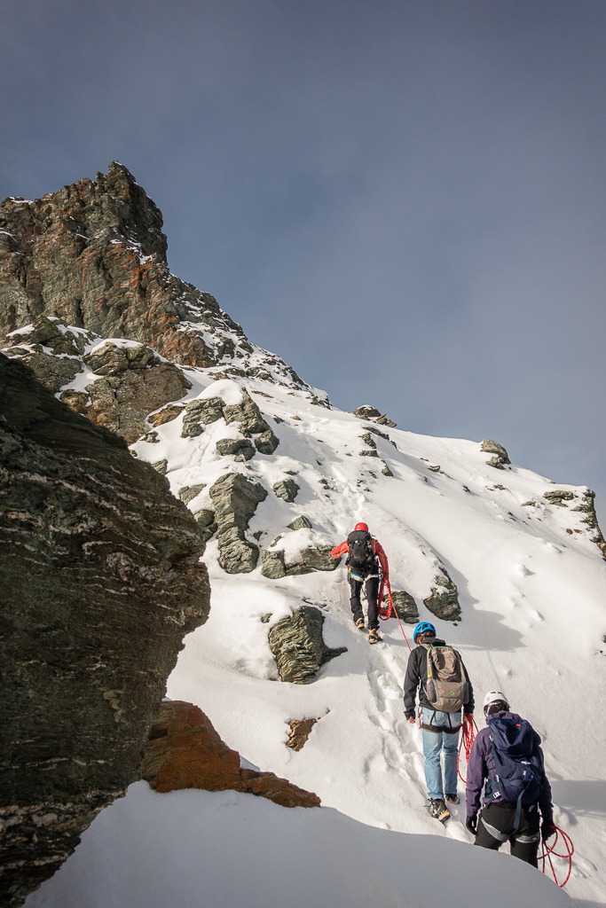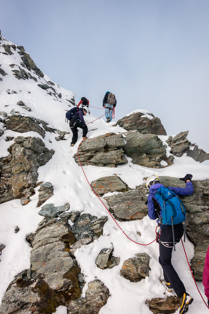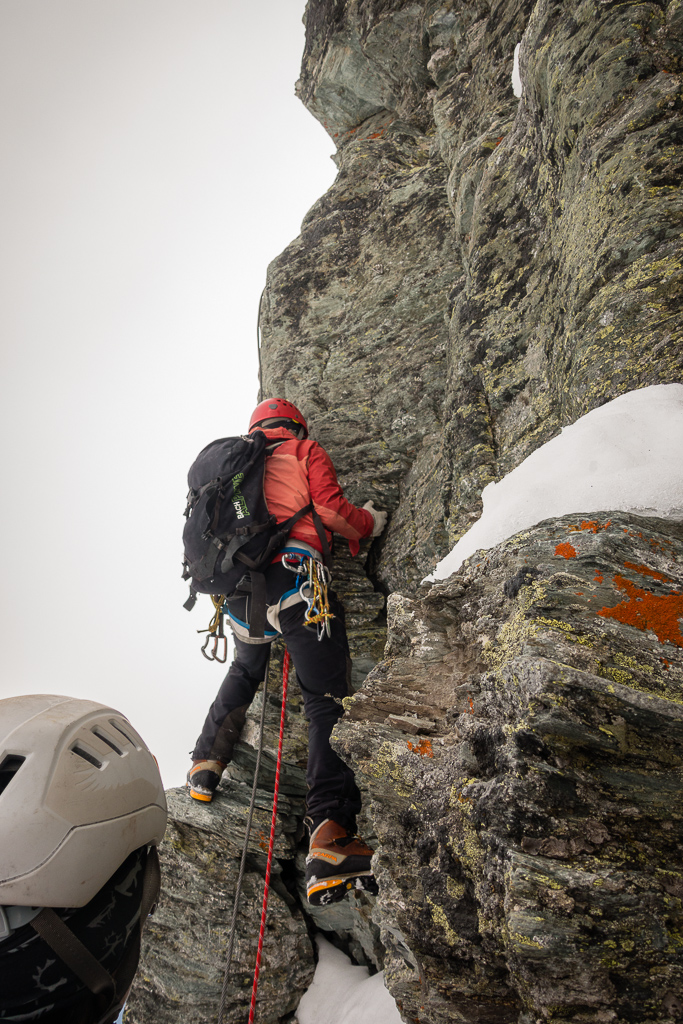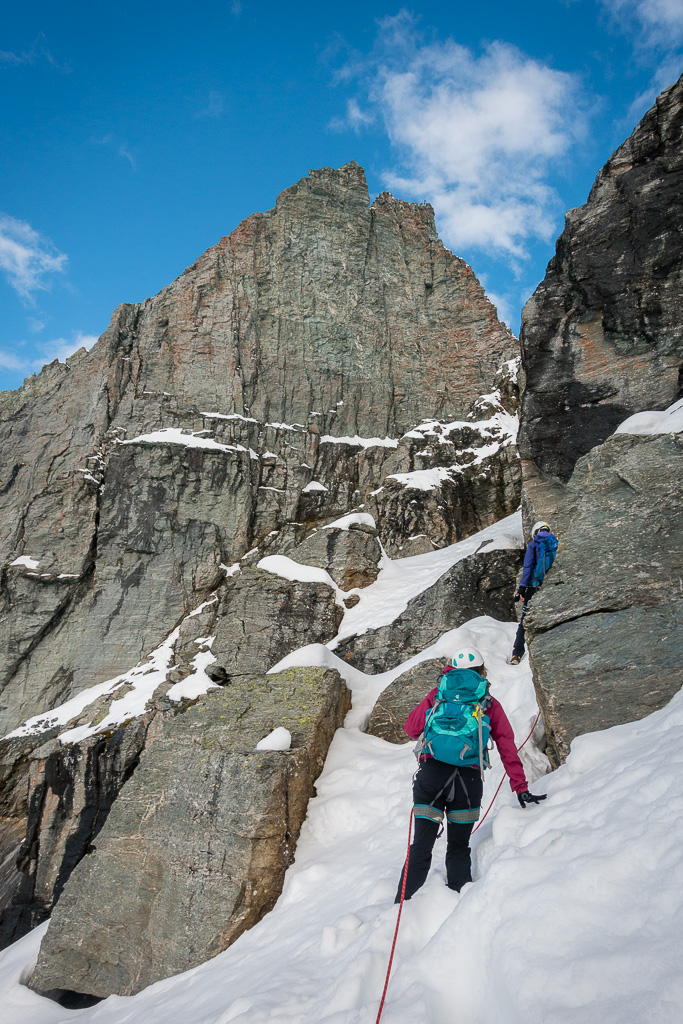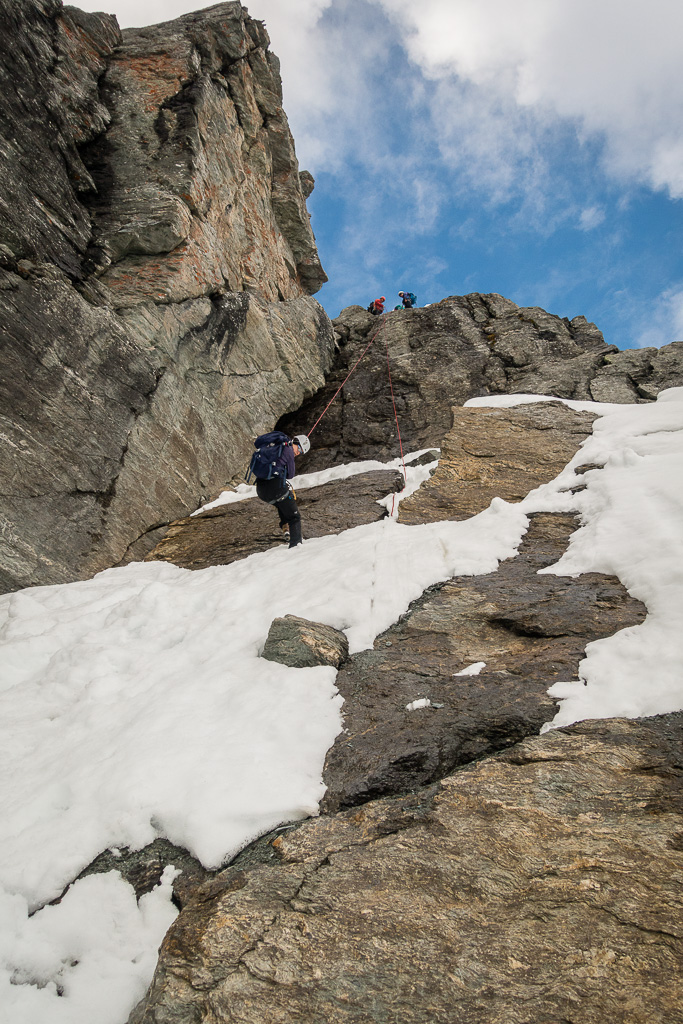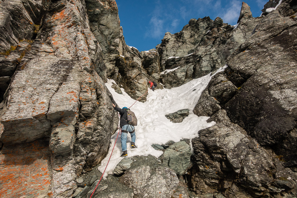 Ein erster Felsblock auf dem Grat wurde über einen handbreiten Riss erklettert. Danach ging es über den schräg geschichteten, schutt- und schneebedeckten Felsgrat immer der Grathöhe entlang bis an den Fuß der ersten steileren Felsaufschwünge. Hier kletterten wir leicht (I-II) über kombiniertes Gelände hoch und stiegen rechts entlang einer hohen Felswand über schräge Platten (II) bis zu einem ersten mehrere Meter hohen Wändchen auf. Dieses wird in einem breiten Riss erklettert (III; 2 Haken). Etwas später erfordert ein weiterer kurzer Absatz mehr Aufwand (-IV; 1 Haken), kann aber bei ausreichender Reichweite mit einem guten Griff an der Kante rechts und einer kleinen Schuppe links einfacher überwunden werden.