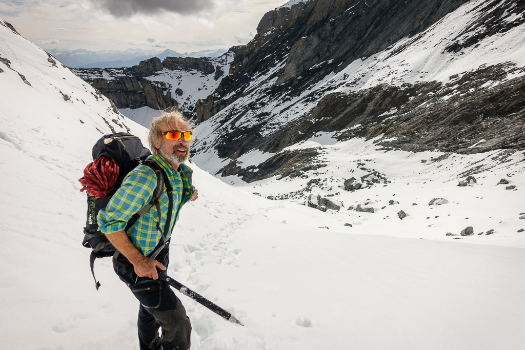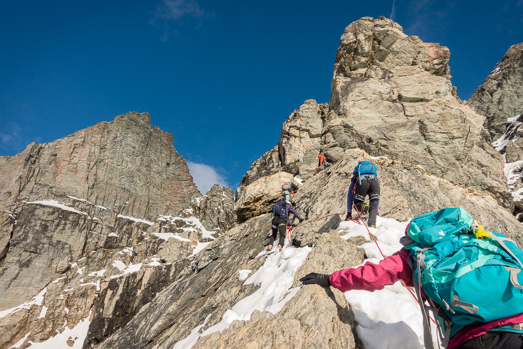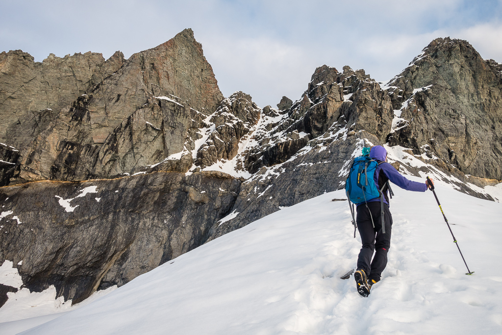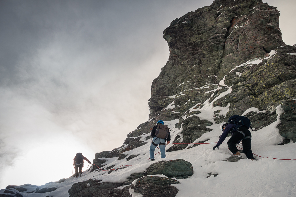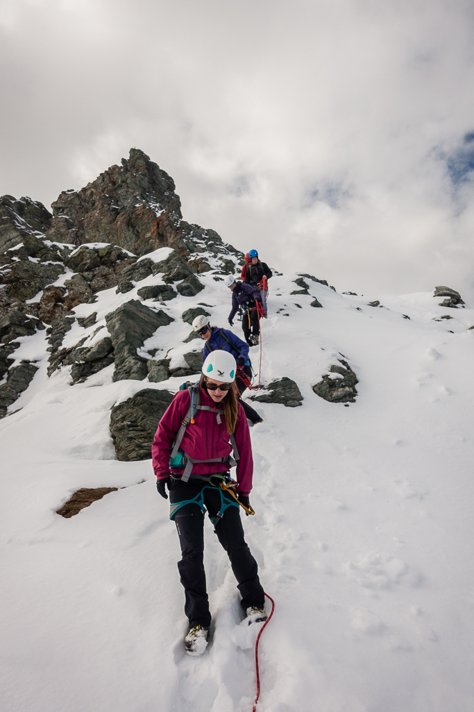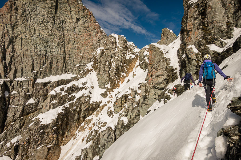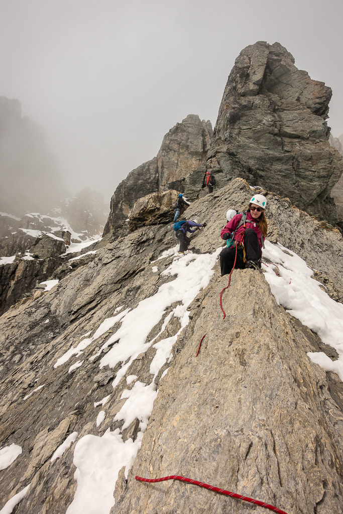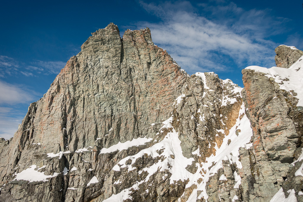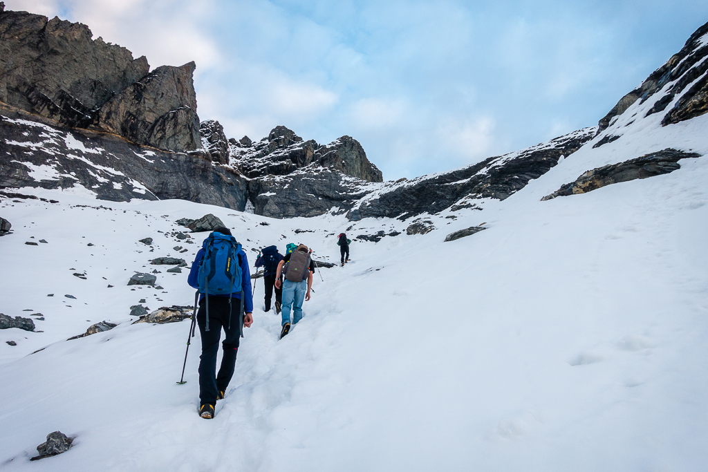 Ein erster Felsblock auf dem Grat wurde über einen handbreiten Riss erklettert. Danach ging es über den schräg geschichteten, schutt- und schneebedeckten Felsgrat immer der Grathöhe entlang bis an den Fuß der ersten steileren Felsaufschwünge. Hier kletterten wir leicht (I-II) über kombiniertes Gelände hoch und stiegen rechts entlang einer hohen Felswand über schräge Platten (II) bis zu einem ersten mehrere Meter hohen Wändchen auf. Dieses wird in einem breiten Riss erklettert (III; 2 Haken). Etwas später erfordert ein weiterer kurzer Absatz mehr Aufwand (-IV; 1 Haken), kann aber bei ausreichender Reichweite mit einem guten Griff an der Kante rechts und einer kleinen Schuppe links einfacher überwunden werden.