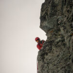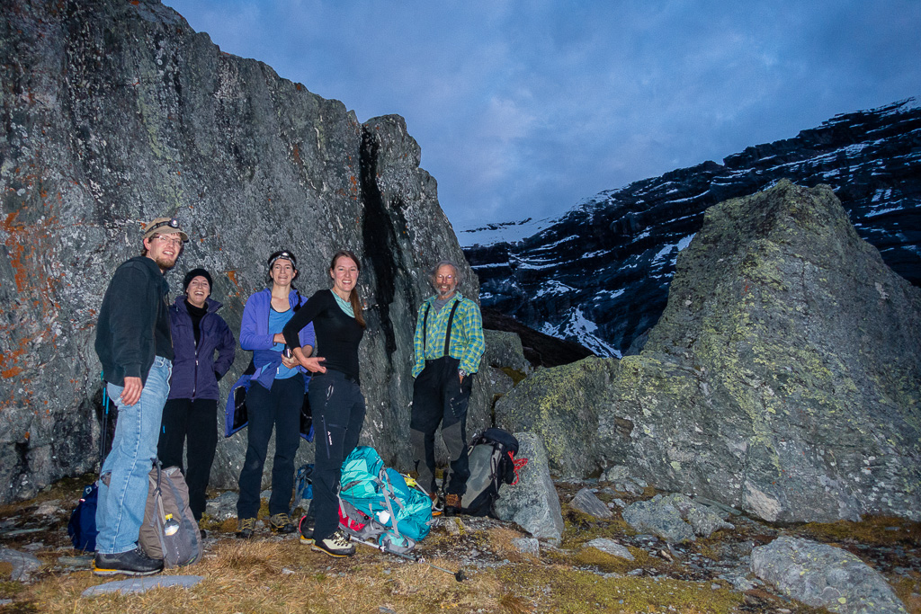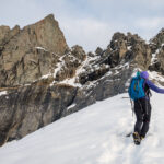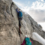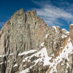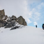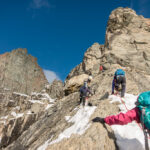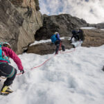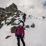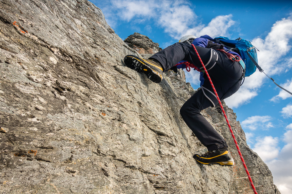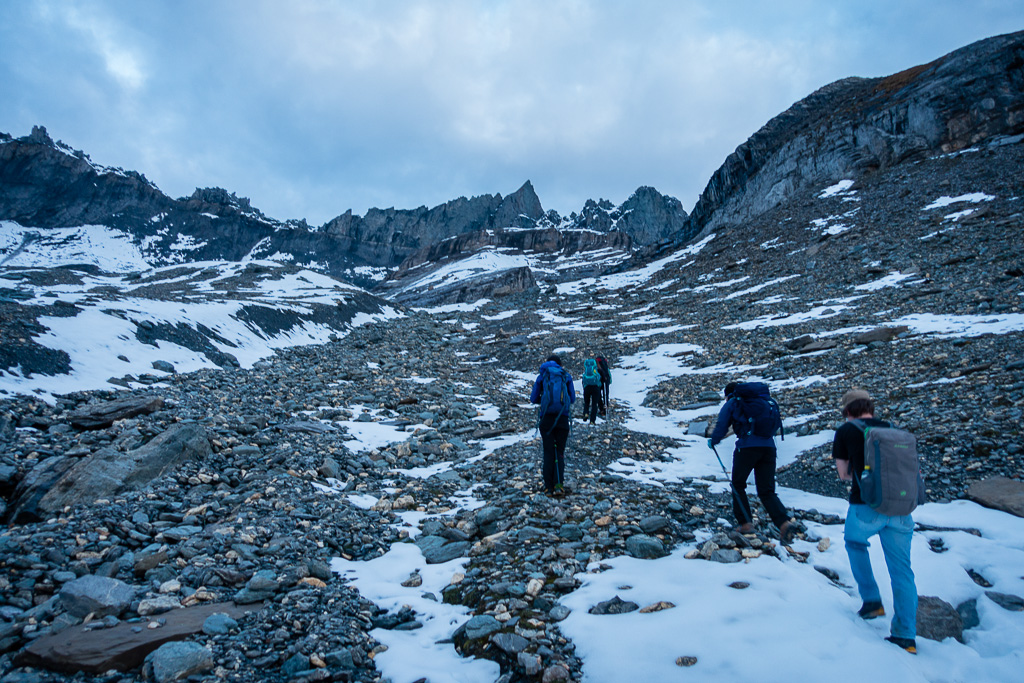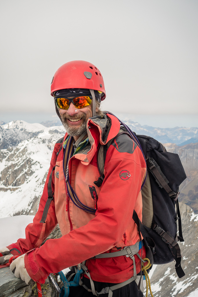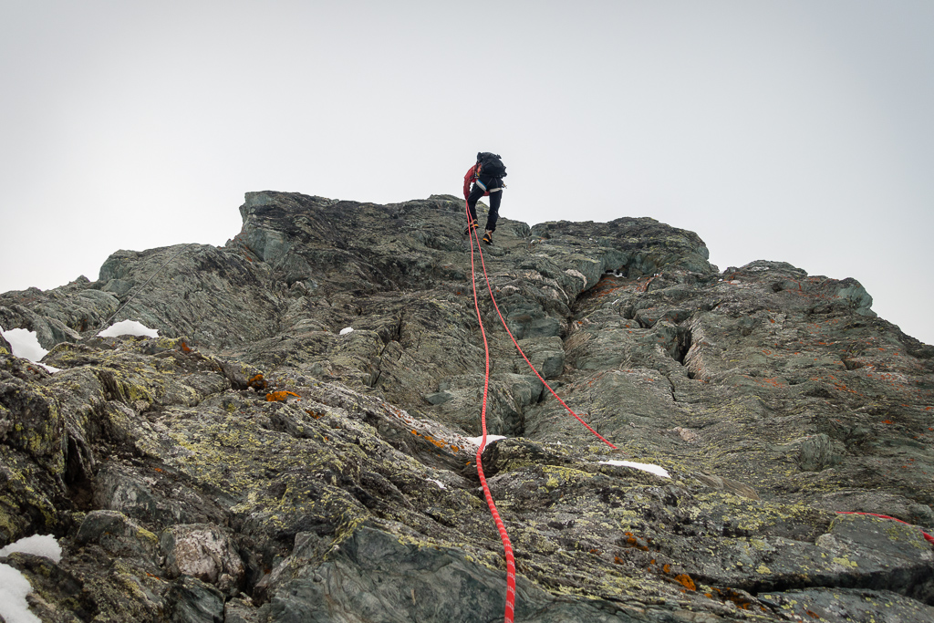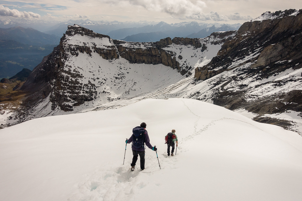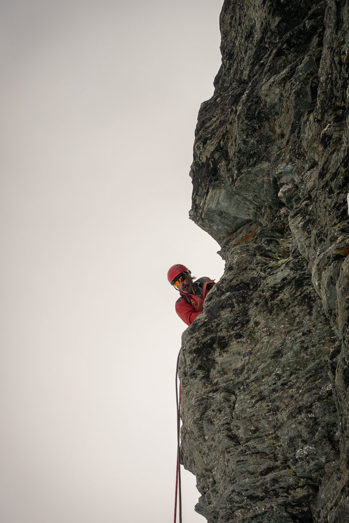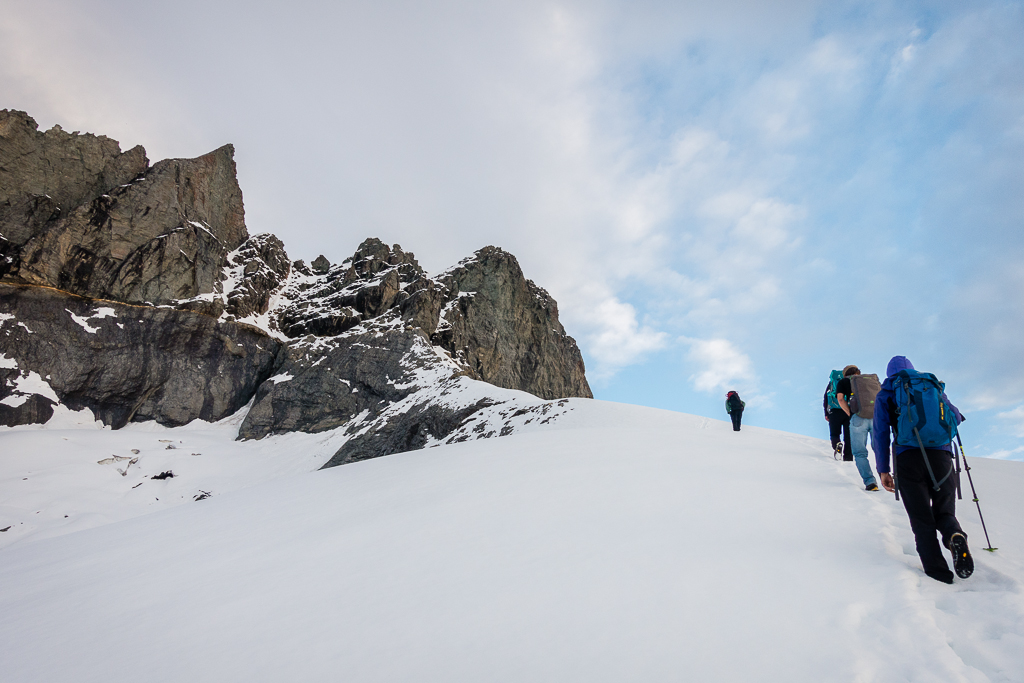 Ein erster Felsblock auf dem Grat wurde über einen handbreiten Riss erklettert. Danach ging es über den schräg geschichteten, schutt- und schneebedeckten Felsgrat immer der Grathöhe entlang bis an den Fuß der ersten steileren Felsaufschwünge. Hier kletterten wir leicht (I-II) über kombiniertes Gelände hoch und stiegen rechts entlang einer hohen Felswand über schräge Platten (II) bis zu einem ersten mehrere Meter hohen Wändchen auf. Dieses wird in einem breiten Riss erklettert (III; 2 Haken). Etwas später erfordert ein weiterer kurzer Absatz mehr Aufwand (-IV; 1 Haken), kann aber bei ausreichender Reichweite mit einem guten Griff an der Kante rechts und einer kleinen Schuppe links einfacher überwunden werden.