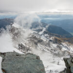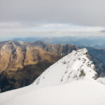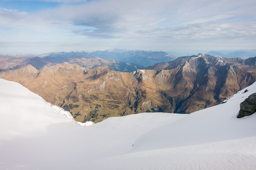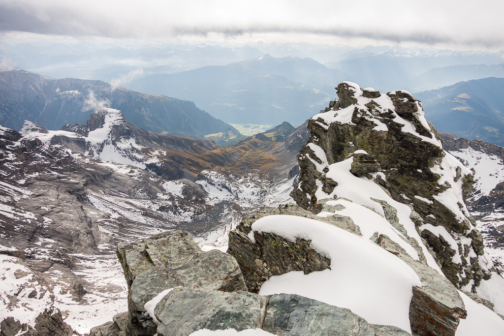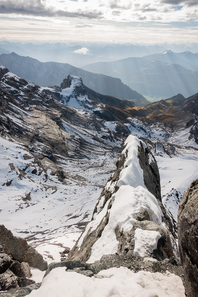 Danach in Abstiegsrichtung links hinüber zum langgezogenen Ausläufer des Südostgrats. Wie im Aufstieg nun wieder auf der Grathöhe hinunter, wobei der inzwischen schon aufgetaute Schnee und die nassen Felsen bei unserem Abstieg große Konzentration erforderten. Das letzte Felshindernis auf dem Grat wird wie bereits früher über seinen Riss abgeklettert. Danach sind die Schwierigkeiten überwunden und man befindet sich wieder im Gehgelände.