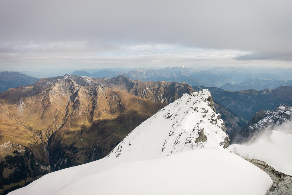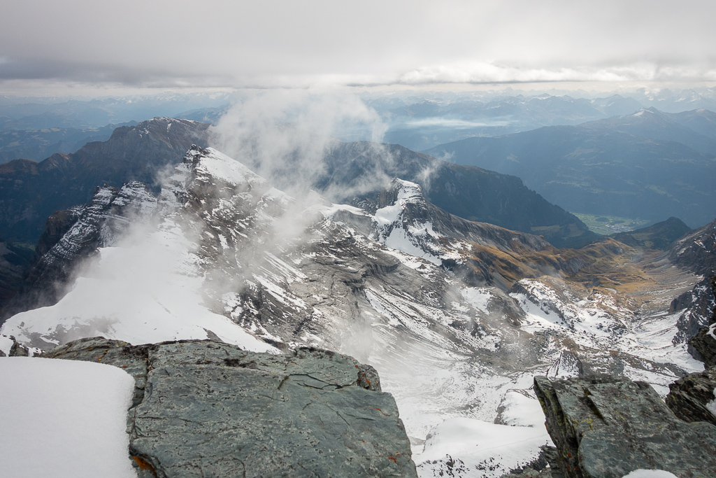Der gewaltige, dreieckige Gipfel des Ringelspitz ist nun ständig im Blick. Die Kante auf der rechten Seite des Gipfels mündet in eine Gratschulter, aus der sich etwas weiter rechts ein markanter dreieckiger Turm erhebt. Wir querten zunächst einen steilen Schneehang in Richtung des Turms und stiegen im Anschluss daran über eine steile, nasse Rinne (Haken) auf die Höhe der Gratschulter auf, auf der wir neben dem Turm ausstiegen. Hier, im Windschatten des Turms, bietet sich erstmals eine freie Sicht nach Norden auf den weiten Ringelfirn, die Berge nördlich des Calfeisentals, Walenstöcke, Alpstein und Bodensee.