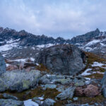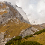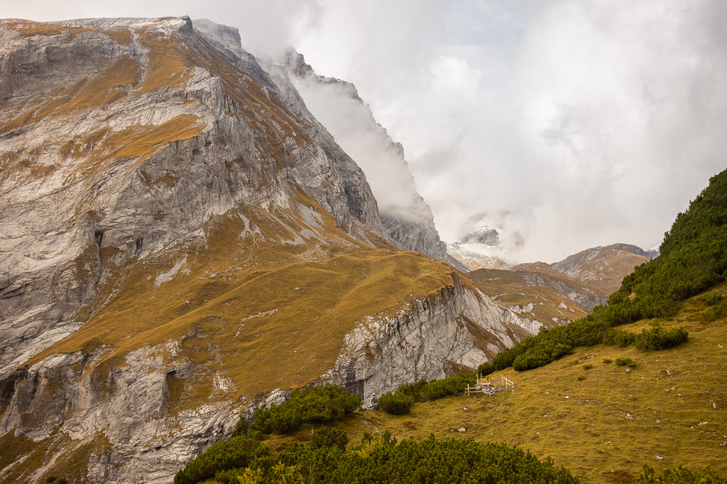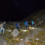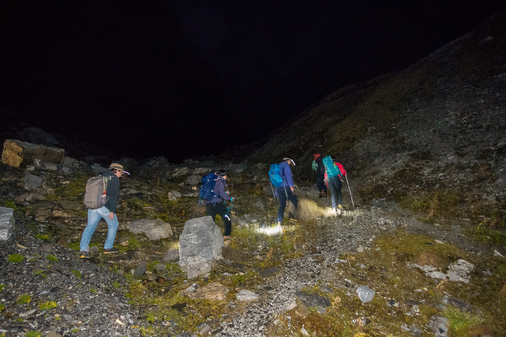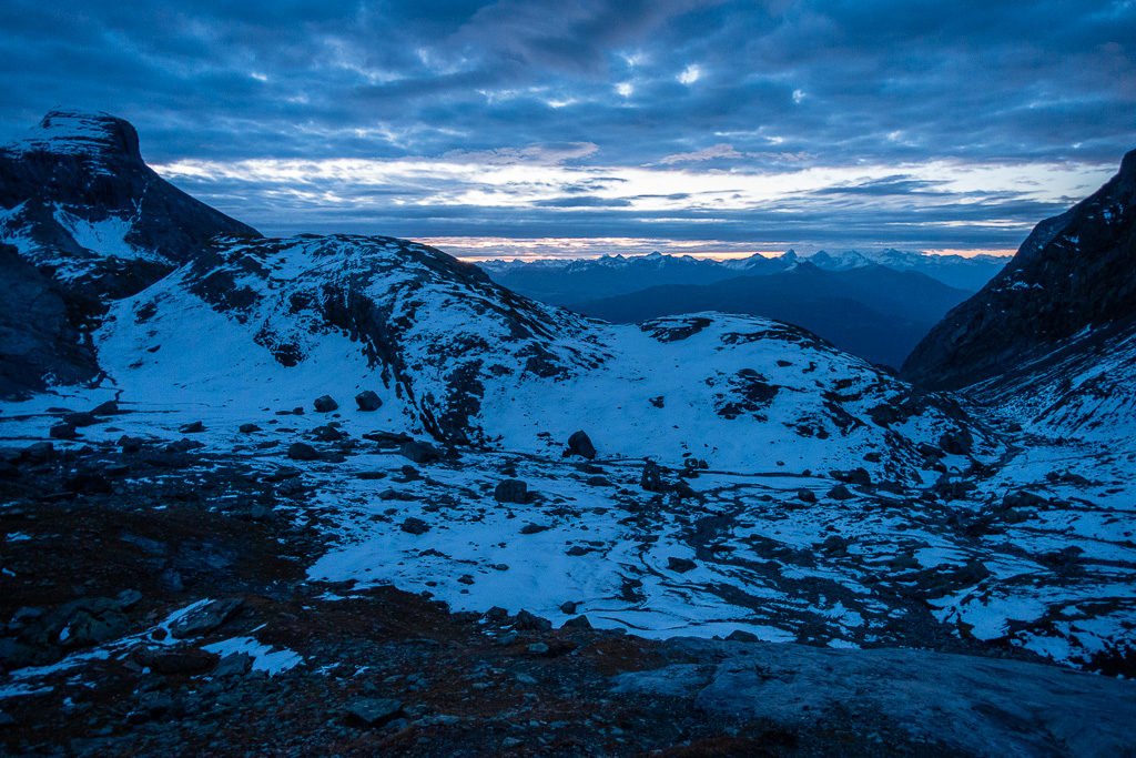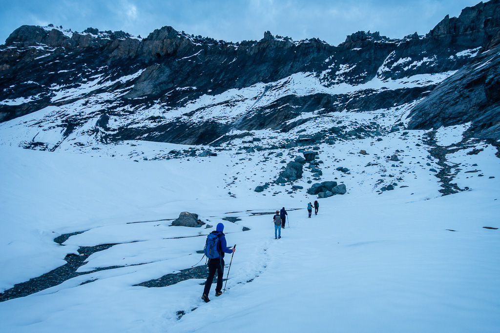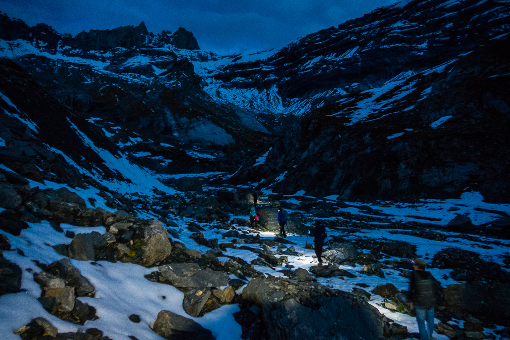 Wir zogen um 5.30 Uhr morgens von der Hütte los und stiegen auf einem guten Weg nach Nordwesten auf. Bei 2.060m verzweigte sich der Weg im Dunkeln unauffällig; wir folgten der linken Abzweigung über Vorder und Mittler Augstberg auf Schutt und Geröll. Bei 2.380m näherten wir uns dem Bach, der aus dem Kessel von Sandböden strömt und querten danach die steilen Geröllhänge unter dem Morchopf auf der westlichen Bachseite. Der Schutt war vom Regen des vorhergehenden Tages durchnässt und geriet leicht ins Rutschen. Hier ist zu beachten, dass der Hang wenige Meter unterhalb des Wegs über eine hohe senkrechte Felswand hinunter zum Bach abbricht – was man im Dunkeln zum Glück nicht so wahrnimmt…