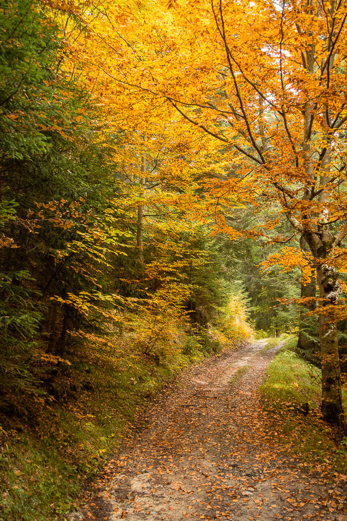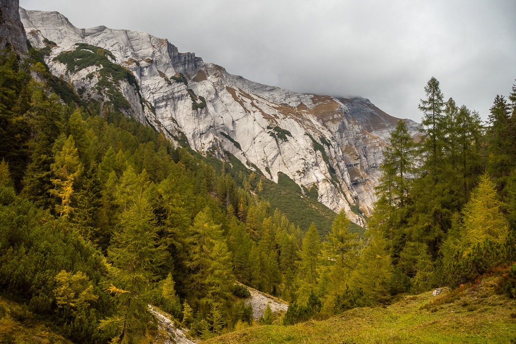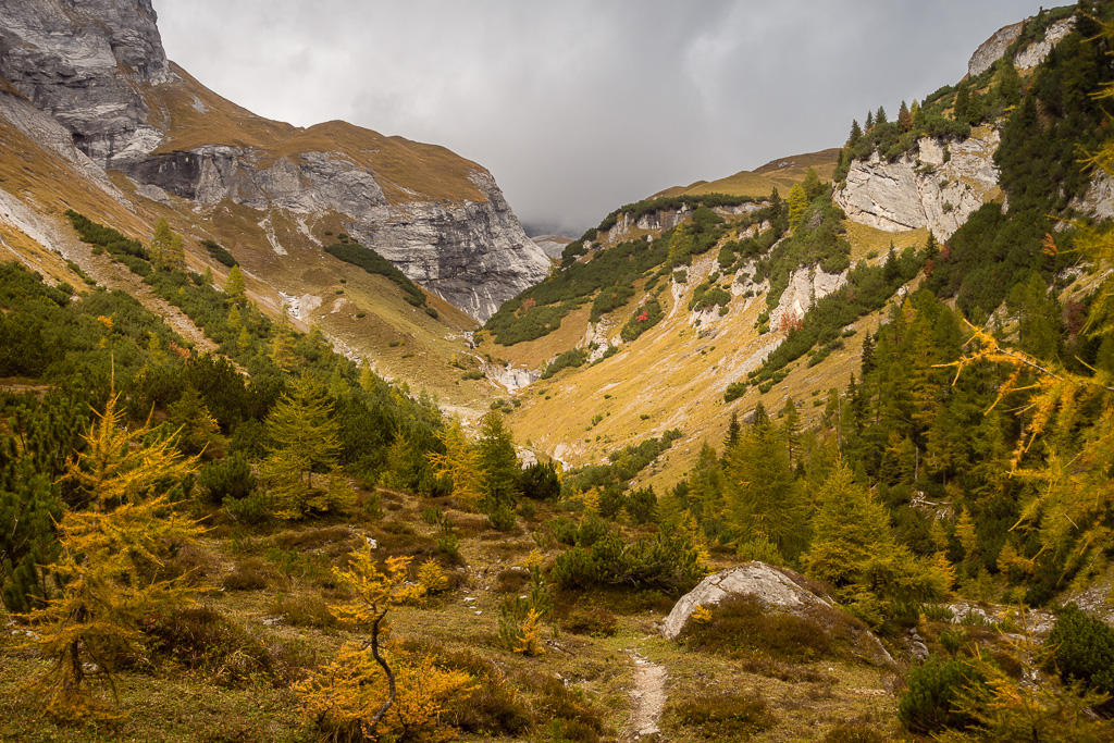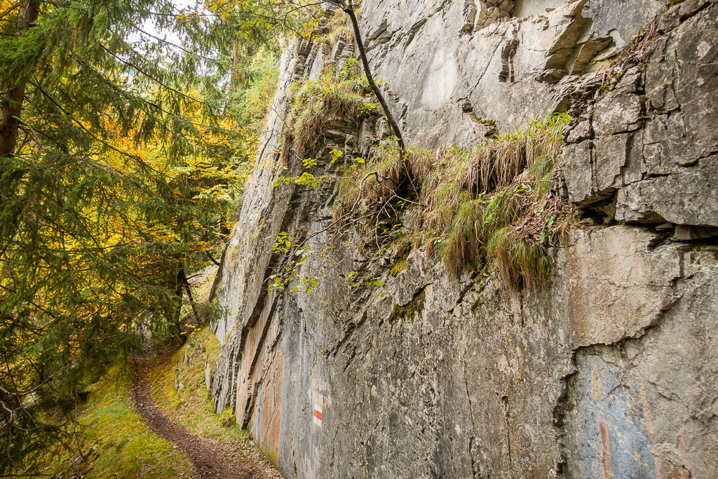 In langen Kehren auf dem Forstweg durch den Sgaiwald aufsteigen. Bis 1.200m gewinnt man nur mäßig an Höhe. Hier zweigt der rot-weiß markierte Weg ins Lawoital nach links ab (Wegweiser). Der Aufstieg wird nun steiler. An einer markanten glatten Felswand vorbei geht es weiter hinauf durch den Vogelsteinwald zur Alphütte von Vorder Säss. Der Weg nähert sich in mäßiger Steigung dem Lawoibach und überquert diesen auf einer Holzbrücke bei 1.600m. Danach geht es auf der westlichen Bachseite weiter zur Alphütte von Hinter Säss.