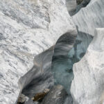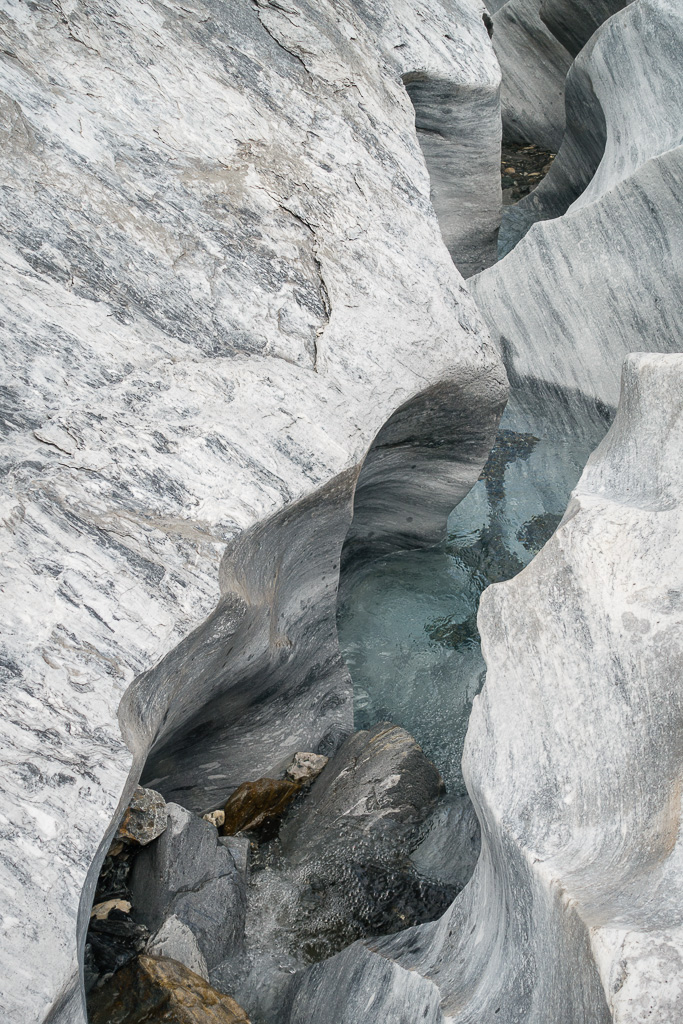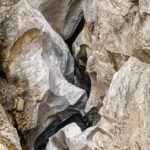 Wir sind unserer Aufstiegsspur bis hinunter zur Fläche von Sandböden gefolgt und stellenweise schon tief im feuchten Schnee eingesackt. Bei Sandböden sind wir dann nicht wie im Aufstieg der westlichen Bachseite gefolgt, sondern sind auf den Wegspuren am östlichen Ufer zu einer interessanten ausgewaschenen Gletscherbachschlucht bei Hinteren Bäch abgestiegen. Diese Schlucht mit zahlreichen Felsformationen kann auch im Rahmen von Canyoningtouren begangen werden. Danach sind wir dann 100m südlich davon durch die Schlucht von Mittleren Bäch abgestiegen, die den Felsformen nach zu urteilen früher wohl ebenfalls Wasser geführt hat, heute aber grasbewachsen und auf Pfadspuren begehbar ist.