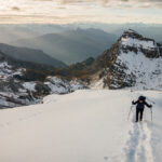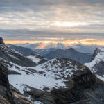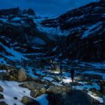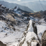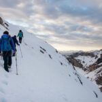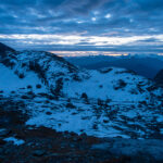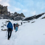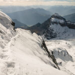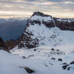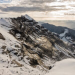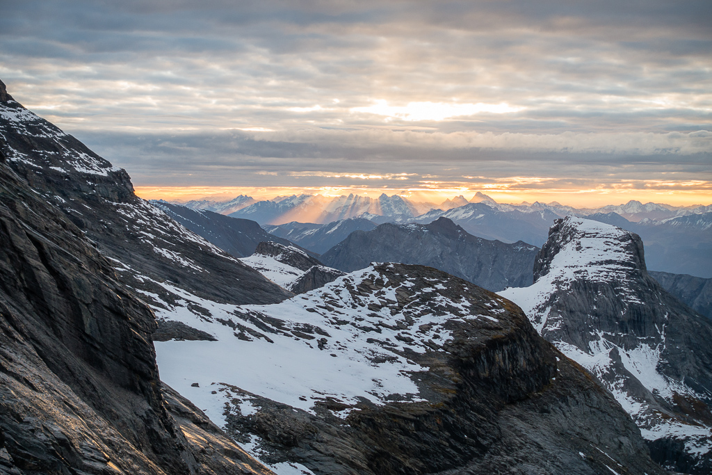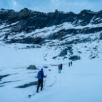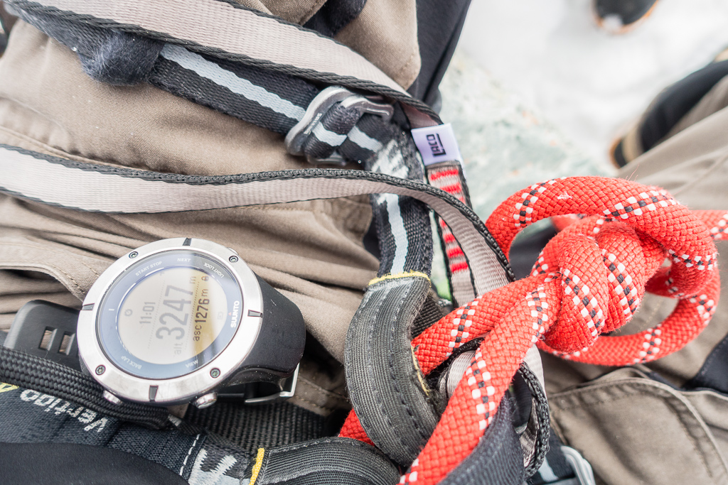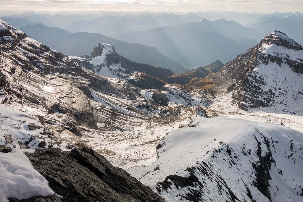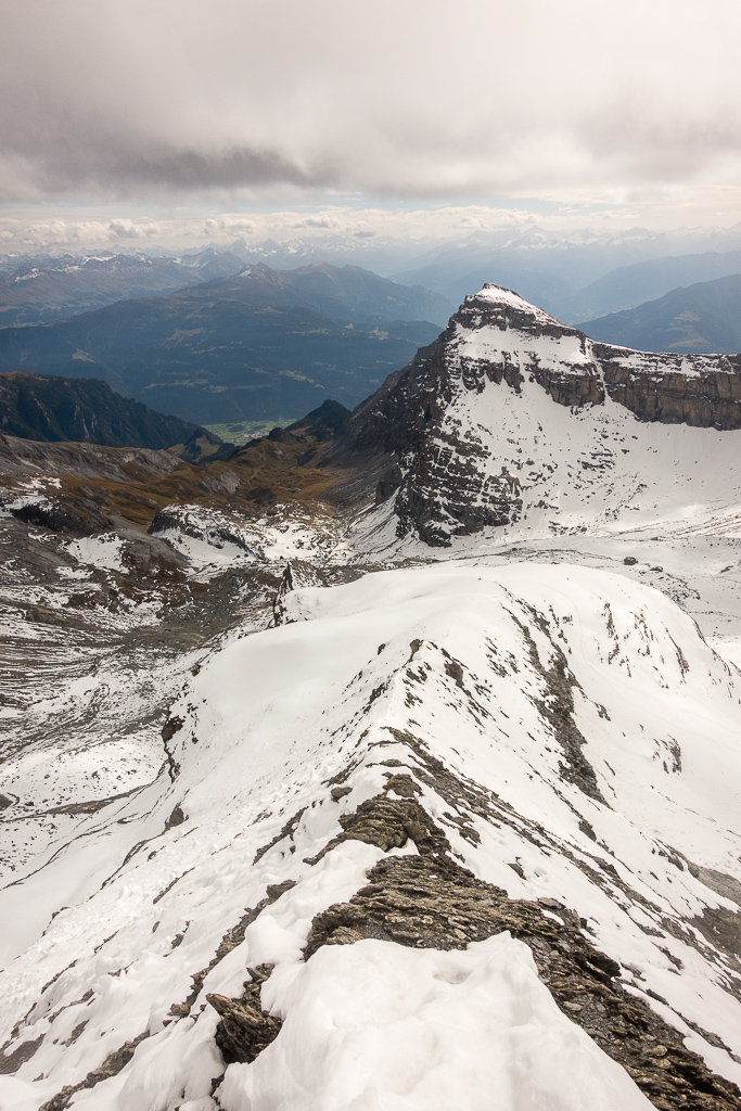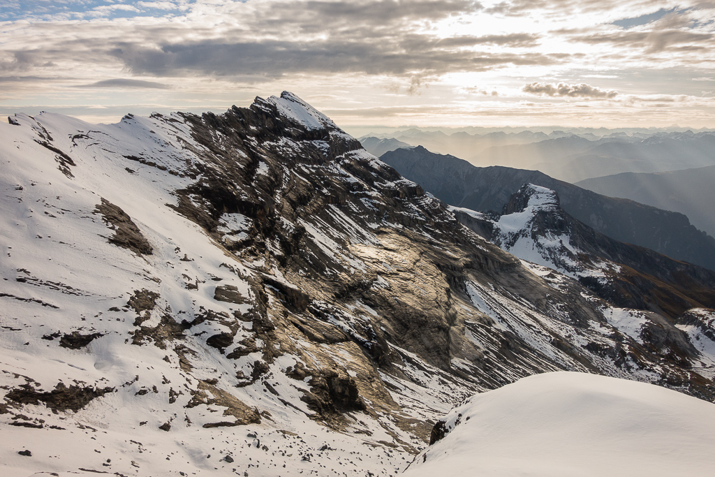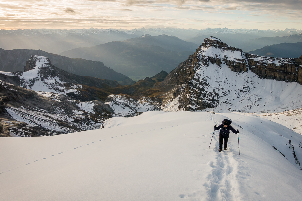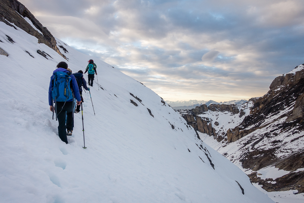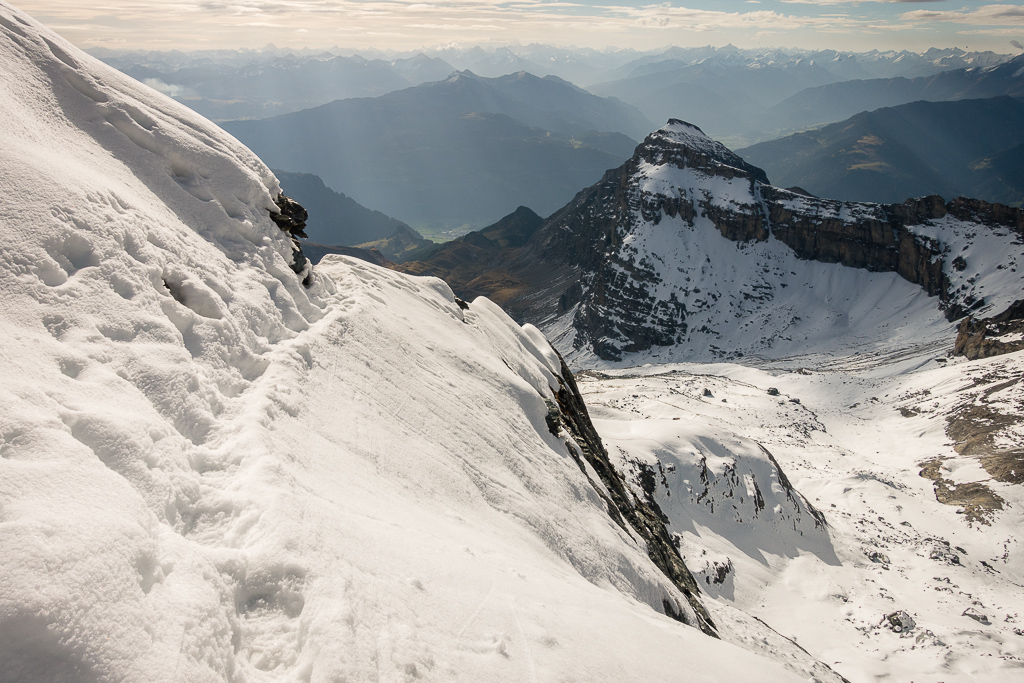 Nun ging es über Geröll und Schnee weiter hangaufwärts nach Nordwesten. Unterhalb der Felsen auf 2.750m querten wir nach Westen und stiegen am östlichen Rand des Taminser Gletschers bis 2.920m auf. Hier, oberhalb der Felsen, querten wir einen steilen Schneehang nach Südosten bis an sein Ende und stiegen dann nach Norden auf den sich nun deutlich ausprägenden Südostgrat auf, der sich von den höherliegenden Felswänden des Ringelspitz herunterzieht. Auf dem schneebedeckten Grat stiegen wir bis zu den ersten Felsen auf, die aus dem Schnee herausragten. Hier seilten wir uns an. In Anbetracht der hartgefrorenen Schneeflanken, die auf beiden Seiten des Grates in die Tiefe führen, lohnt es sich, die Ausrüstung im Auge zu behalten. Beim Aufsetzen des Helms verabschiedete sich nämlich bereits meine Stirnlampe von mir und rauschte auf dem Schnee mit rasantem Tempo in den Abgrund, bevor ich auch nur reagieren konnte.
