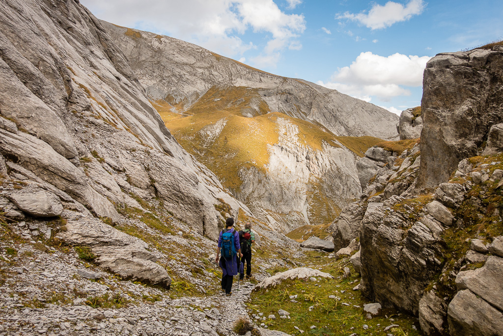 Über abwechslungsreiches, felsdurchsetztes Grasgelände ging es dann hinunter zu einer Alphütte („Berghüttli“ auf der Landeskarte), auf einer Wegspur weiter bis zur Einmündung in den Aufstiegsweg und über diesen zurück zur Ringelspitzhütte.