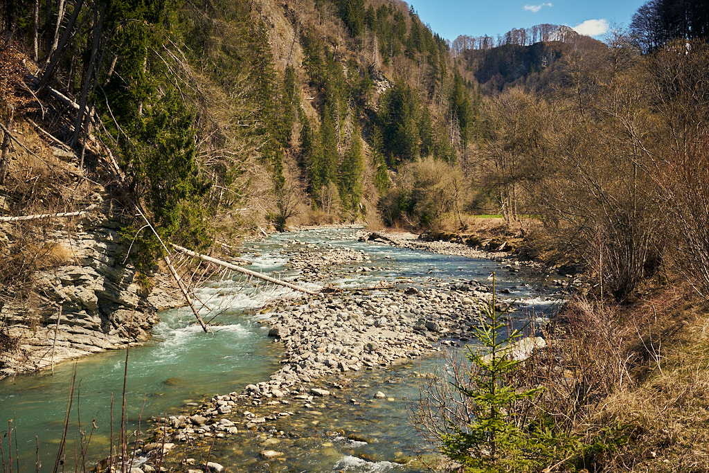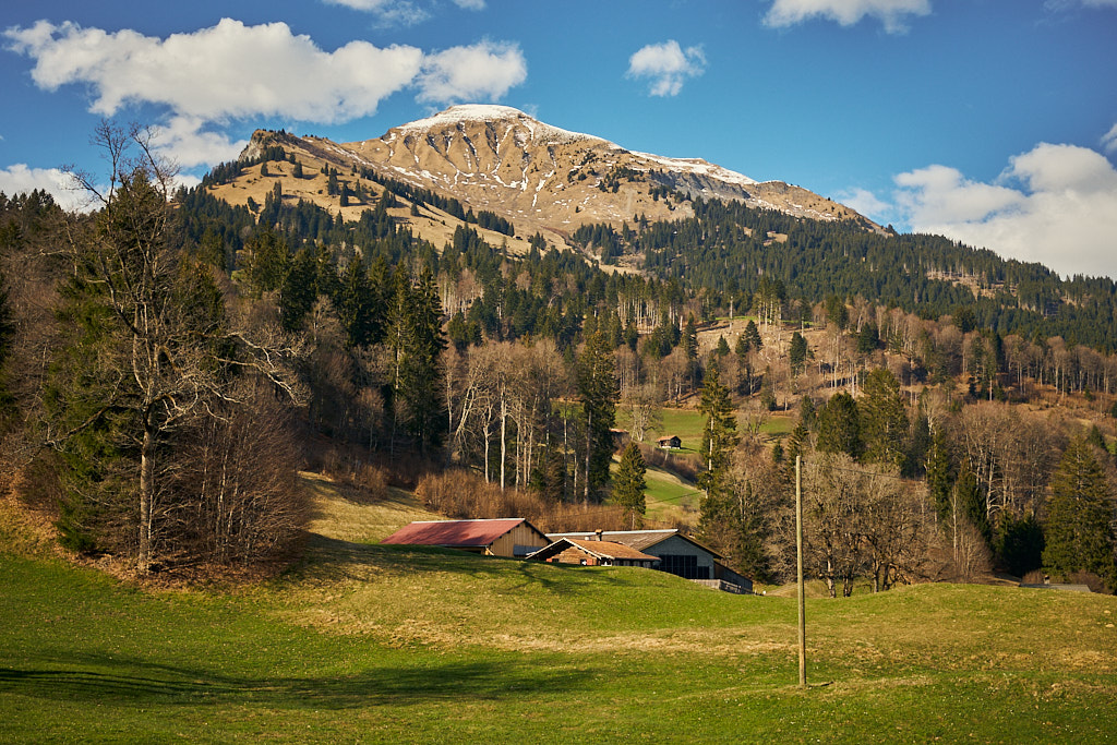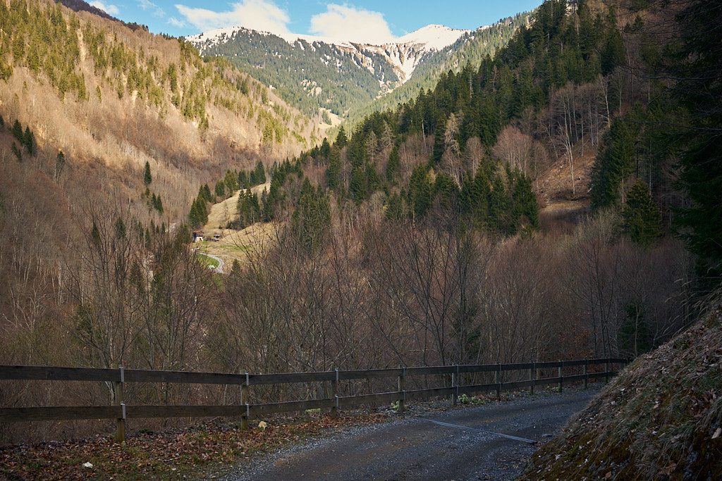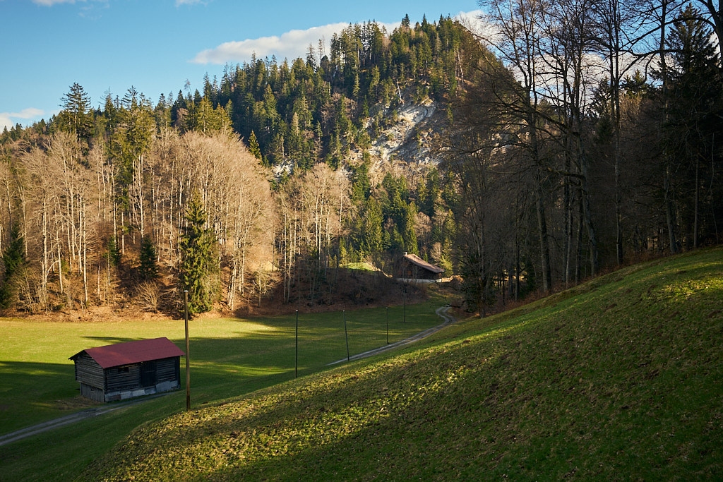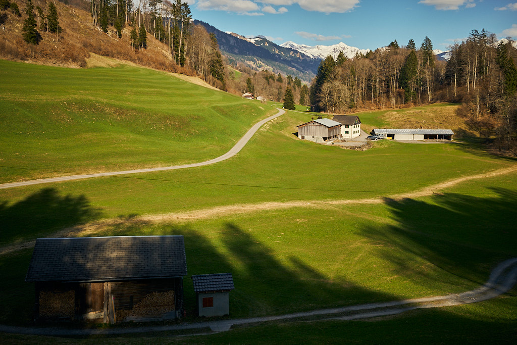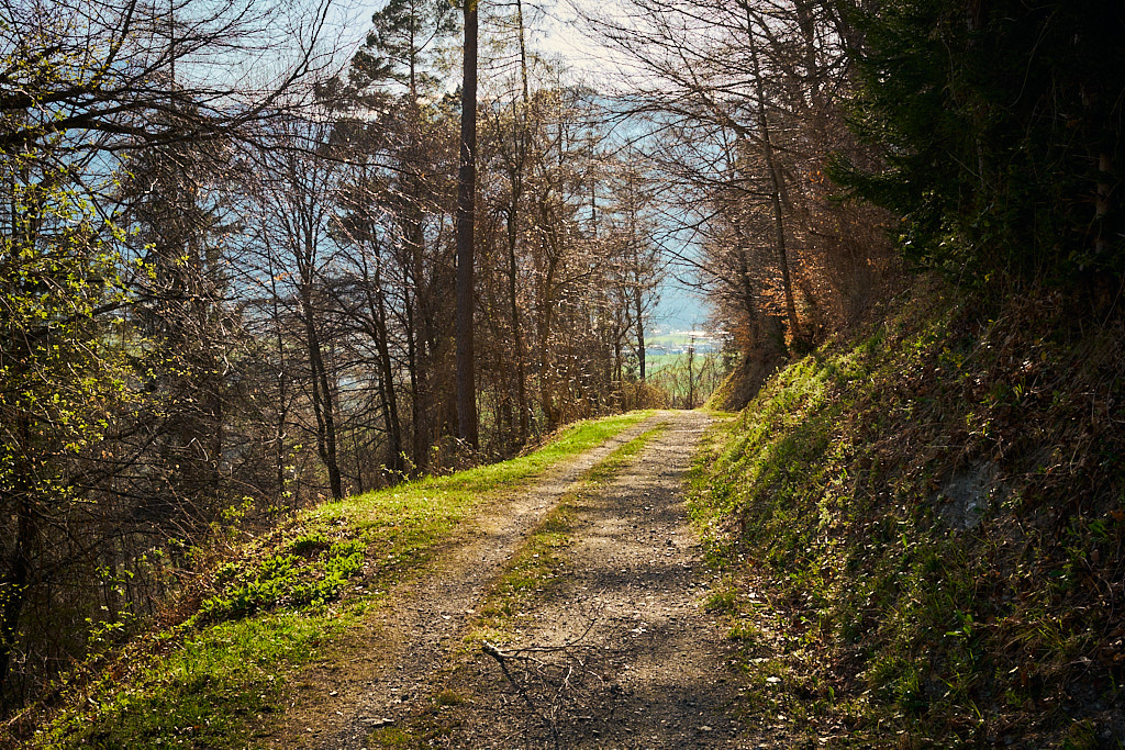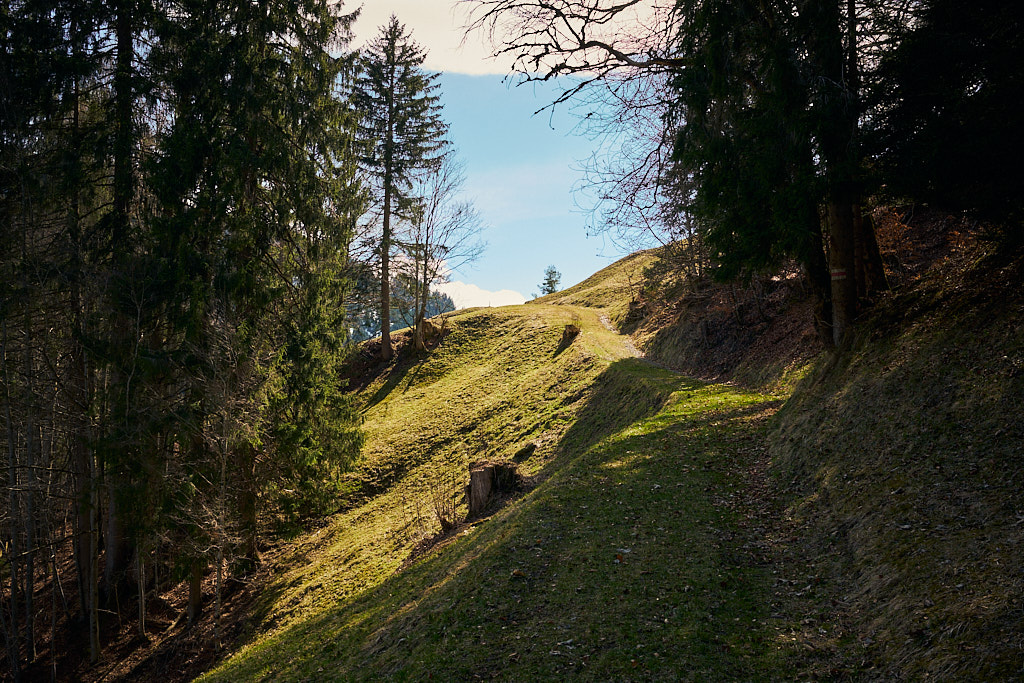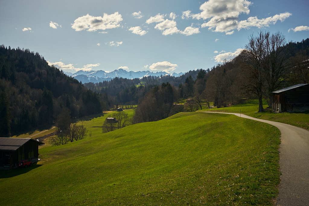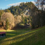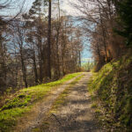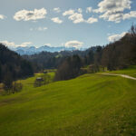 Jetzt ging es zunächst noch weiter hinauf zu Ferienhaussiedlungen bei Rongellia und Riedwies. Hier begann eine lange, kurven- und sehr aussichtsreiche Abfahrt nach Buchen. Dahinter führte ein Feldweg fast einen Kilometer in das Buchner Tobel hinein und auf der anderen Hangseite wieder hinaus. Dort kam ich in Lunden an, das ich wie Buchen bereits von der letzten Tour her kannte: von Buchen aus führte damals nämlich eine tiefergelegene Strasse direkt nach Putz.