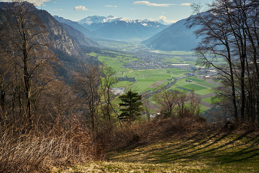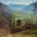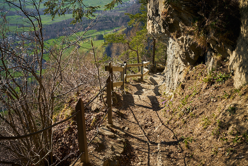 Die letzten paar Meter zum höchsten Punkt auf dem Fadärastein mit einem kleinen Rastplatz musste ich schiebend auf einem Wurzelweg zurücklegen. Von diesem Aussichtspunkt eröffnete sich eine grandiose Aussicht auf das gesamte Rheintal von Chur über Landquart bis hin ins Sarganserland zum Gonzen.