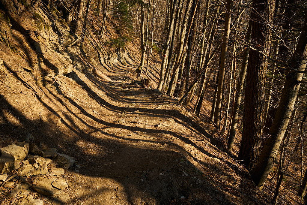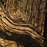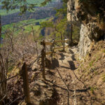 Nach einer Fotopause liess ich Luft aus den Reifen und rüstete mich für die Abfahrt ins Rheintal. Der oberste Teil des Saliswegs war sehr verblockt mit nur kurzen Geraden zwischen den sehr engen Spitzkehren. Diesen Teil schob ich grösstenteils, besonders da es jenseits vom anfangs noch vorhandenen Geländer fast senkrecht in den Abgrund ging. Je weiter ich hinunterkam, desto länger und fahrbarer wurden die geraden Abschnitte und Spitzkehren. Der mittlere Teil wurde langsam zum Flowtrail und verbreitete sich nach unten immer, bis er im untersten Abschnitt zum gewöhnlichen Forstweg mutierte. Einige Wanderer und Trailrunner kamen mir im Aufstieg entgegen, zum Glück allerdings erst in der unteren Hälfte.