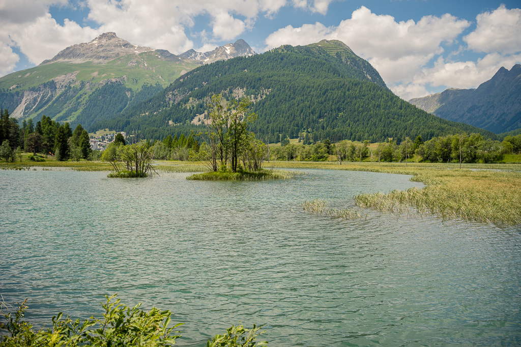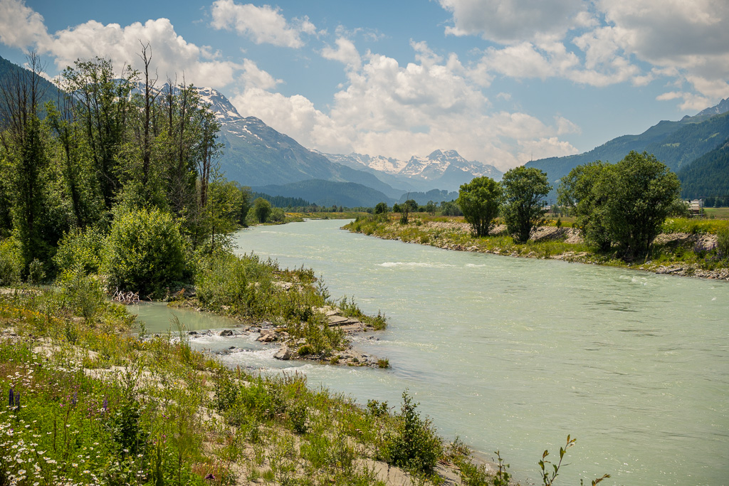 Die nächste Etappe führte von La Punt auf dem Inntal-Radweg in Richtung St. Moritz, wo dann noch vor St. Moritz die Entscheidung für die Weiterfahrt dorthin oder aber für das Abbiegen in Richtung Pontresina anstehen würde. Auf der schönen Strecke am Ufer des Inn entlang, am kleinen See Lej da Gravatscha und dem Flugplatz Samedan vorbei bis zum Verzweigungspunkt bei Punt Muragl herrschte heftiger Gegenwind. Dieser hatte mir schon bei meiner ersten Biketour ins Engadin im letzten Jahr zu schaffen gemacht. Mit dem Gravelbike konnte ich mich diesmal gefühlt etwas aerodynamischer durch den Gegenwind bewegen. Ich erreichte Punt Muragl ohne übermässige Kraftanstrengung und beschloss, nach Pontresina weiterzufahren.