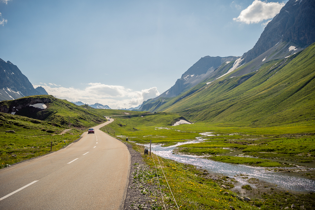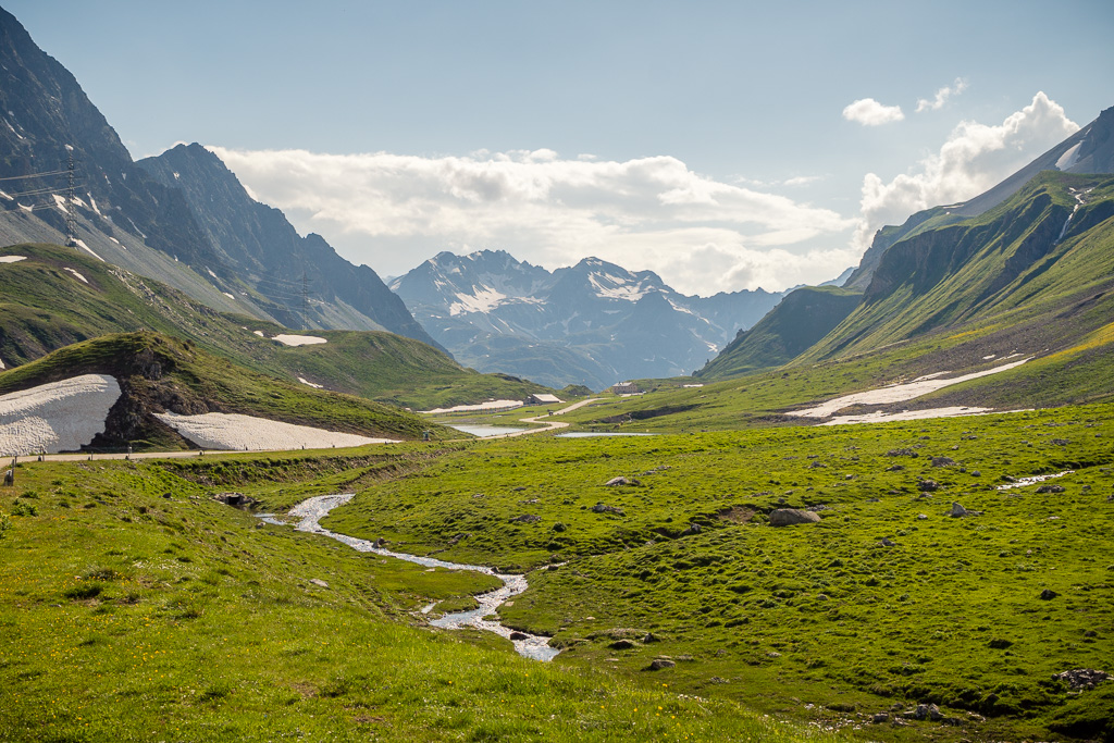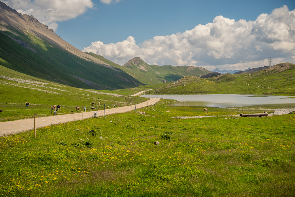 Ich machte mich mit dem Gravelbike also wieder einmal auf die Abfahrt nach Alvaneu Bad hinunter und kurbelte von dort über Filisur, Bergün, Preda am Lai da Palpuogna vorbei zum Albulapass hinauf. Es war warm, der Puls war schon auf flacher Strecke bei Filisur ungewöhnlich hoch und ich überlegte mir schon, wie weit ich unter diesen Umständen wohl kommen würde. Ich fuhr einfach stetig weiter, während die Begegnung mit jedem bekannten Wegpunkt auf der Strecke – dem Kopfsteinpflaster im Dorfzentrum von Bergün, dem Bahnhof von Preda, dem Lai da Palpuogna – mir wieder erneut etwas Auftrieb im Hinblick auf die Passhöhe gab. Dort oben angekommen, wehte ein kühler, erfrischender Wind und auch in Richtung Engadin zeigte sich der Himmel nach wie vor von seiner besten sonnig-blauen Seite. Derart motiviert, machte ich mich auf die genussvolle Abfahrt vom Albulapass nach La Punt und kam ziemlich entspannt und vom kräftezehrenden Aufstieg erholt dort unten an.