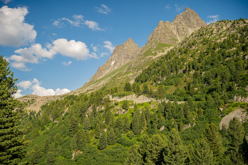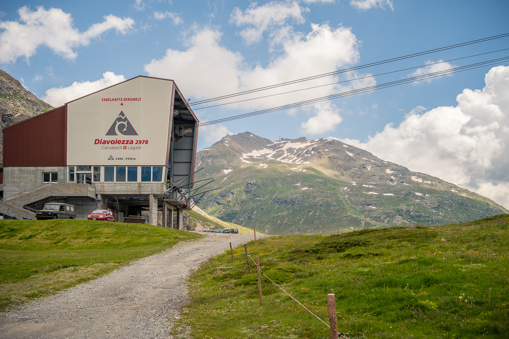 Die Passstrasse zog sich im weiteren Verlauf lange mit mässiger Steigung dahin. Das Hauptproblem war erneut ein aufkommender Gegenwind, aber ich kam gut voran. Als Ansporn und nächste Etappenziele waren zudem die Seilbahnanlagen von Diavolezza und Lagalb schon von weitem zu sehen.