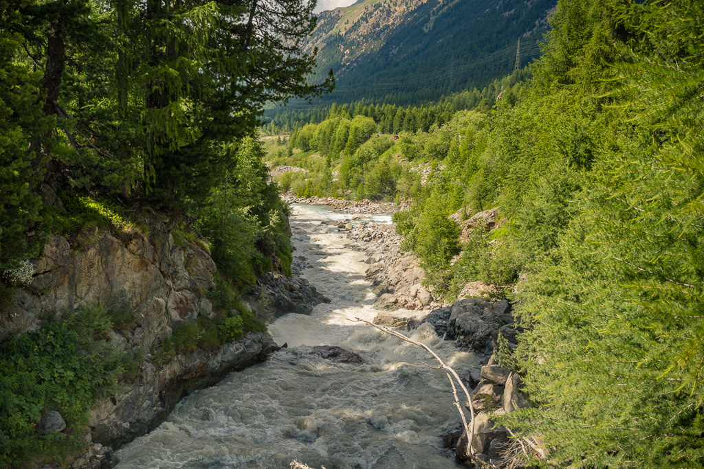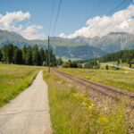 Vor Morteratsch stand dann eine steile Geländestufe bevor. Der Trail stieg hier wieder etwas steiler und verblockter zum Campingplatz ab. Ich umging diese Stelle, indem ich noch oben bei Pro Nuov auf einer Brücke zur Passstrasse zurückkehrte und diese dann unten beim Campingplatz wieder verliess. Danach ging es am Bahnhof von Morteratsch auf der Strecke vom Hinweg zurück. Dank des leichten Gefälles kam ich sehr schnell und energiesparend wieder in Pontresina und Punt Muragl an.
