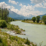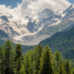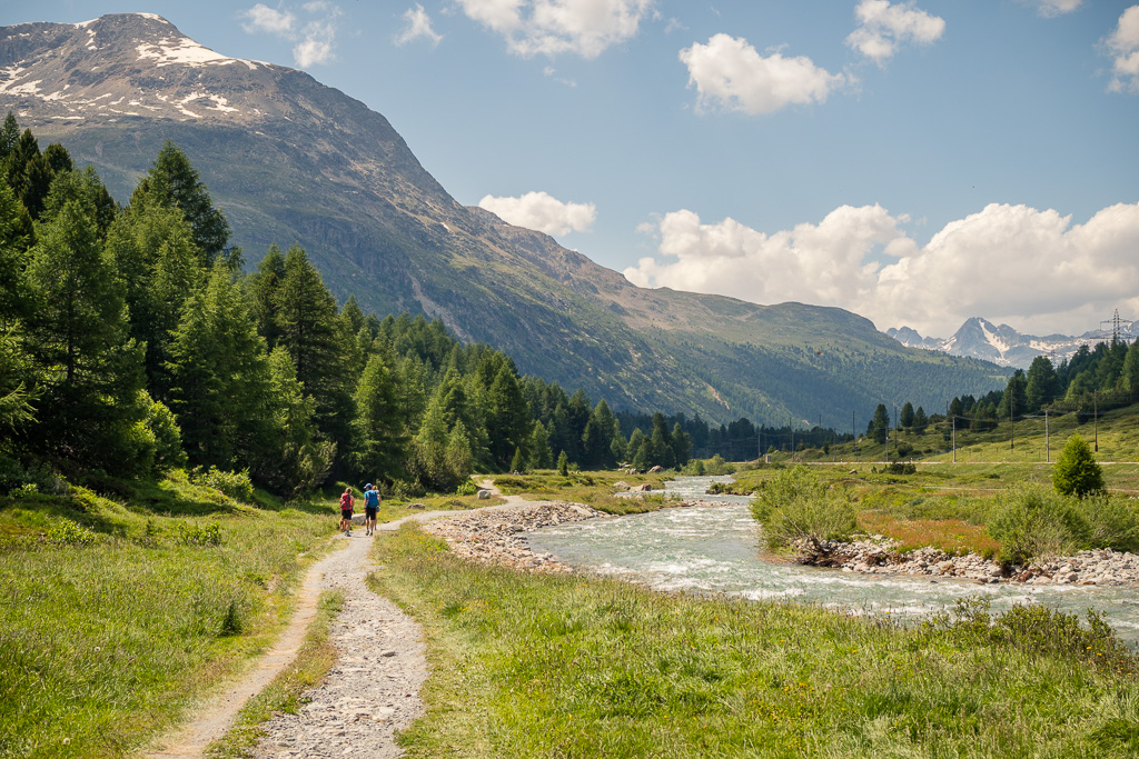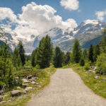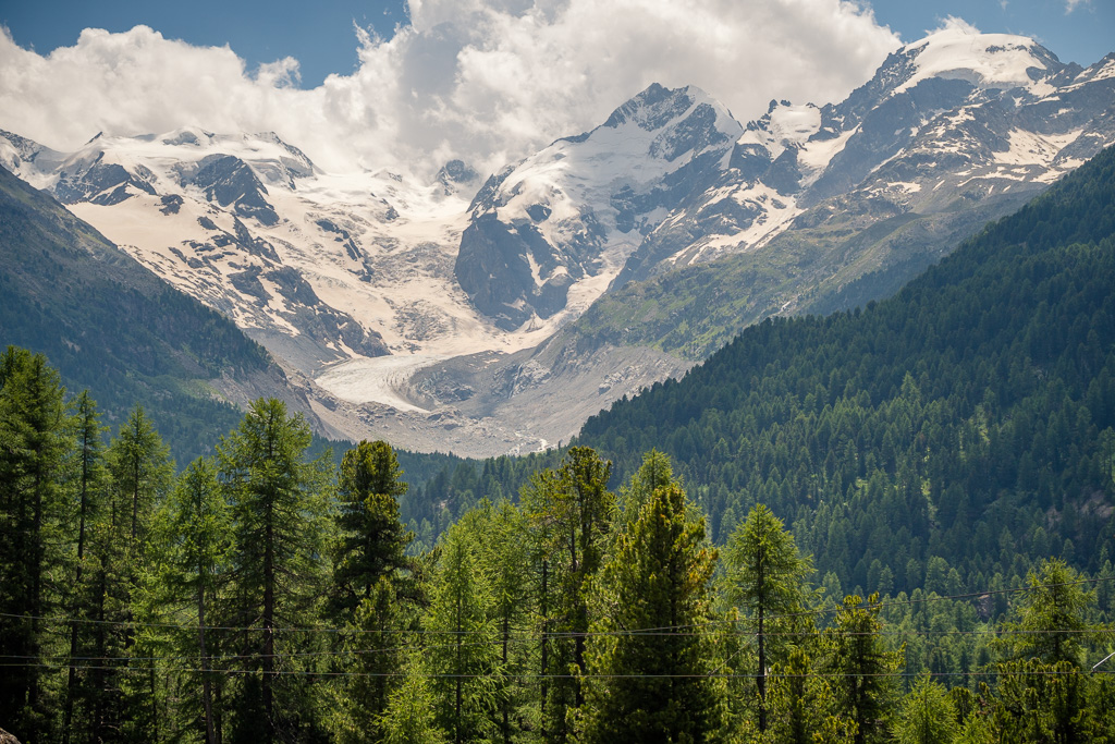 Weiter ging es über offene Felder zum Bahnhof von Pontresina, dort über eine Umleitung in den Ort hinein, bei Surova wieder zurück zum Waldrand und auf einen breiten Radweg südlich der Bahnlinie vom Bernina-Express entlang. Ich erreichte als Nächstes den Bahnhof und Campingplatz von Morteratsch, einem wahren Tummelplatz für Ruhesuchende am heutigen Tag. Von hier aus starteten wir schon einmal zu unserer Wanderung zur Bovalhütte SAC. Alternativ zu diesem Hüttenweg führt auch ein breiter Schotterweg taleinwärts zur Gletscherzunge des Morteratschgletschers. Ich folgte diesem Weg noch einige Hundert Meter, um ein Foto der Berninagruppe machen zu können.