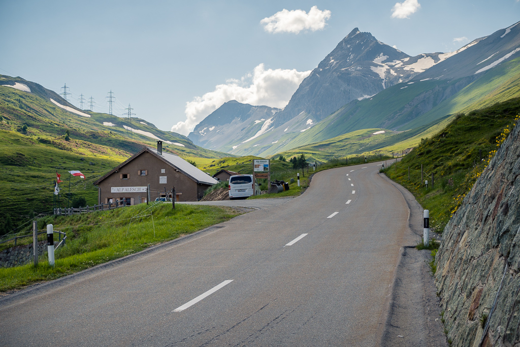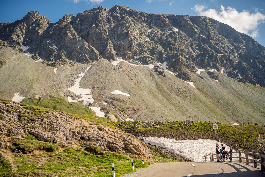 Der zweite Aufstieg des Tages zum Albulapass begann mühsam auf den ersten steilen Kurven von La Punt aus. Der Bikecomputer war wieder auf verbleibende Distanz und Höhenmeter eingestellt und beide Zahlen schienen nicht vom Fleck zu kommen, während ich im Schneckentempo im grellen Gegenlicht der Nachmittagssonne hochkurbelte. Bei der Alp Alesch war ich schon ziemlich angezählt und zum Glück folgte bald danach der flachere obere Teil der Passstrasse durch die Val d’Alvra. Erschöpft erreichte ich dann endlich die Passhöhe und gönnte mir eine Erholungspause, um die kurvenreiche Abfahrt nach Preda und Bergün dann wieder mit der gebotenen vollen Konzentration in Angriff nehmen zu können.