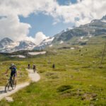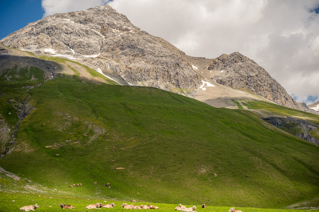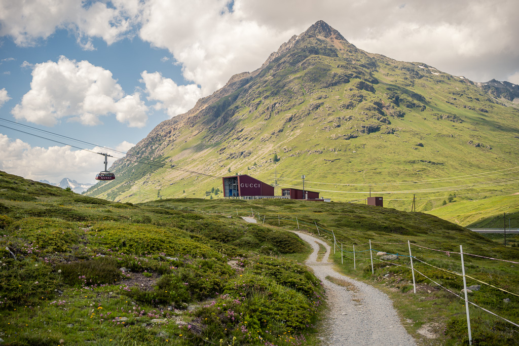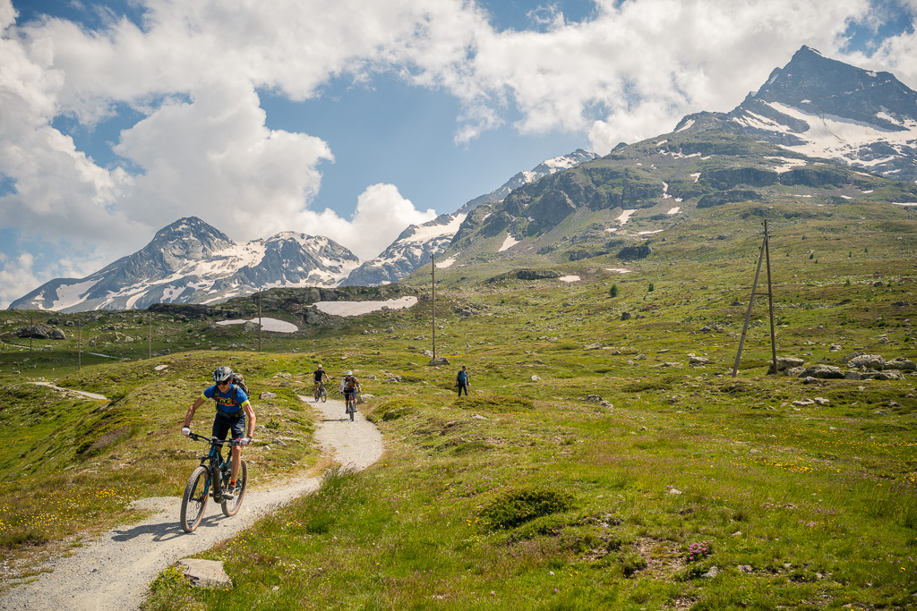 Ich ging auf der Passhöhe für einige Zeit in mich und entschloss mich dann für Variante 4). Einerseits bestand immer noch die Möglichkeit von späteren Gewittern. Ich hielt es zudem für besser, die Themen «Livigno» und «Tirano» in eigenständige Abenteuer zu verpacken. Auch hatte ich bei dem regen Ausflugsverkehr und der Erinnerung an die überfüllten Züge von vorgestern immer noch überhaupt keine Lust auf Zugfahrten heute. Die Abfahrt mit dem Gravelbike zwischen all den Mountainbikern auf dem Biketrail würde hingegen sicher eine spannende Sache werden.