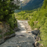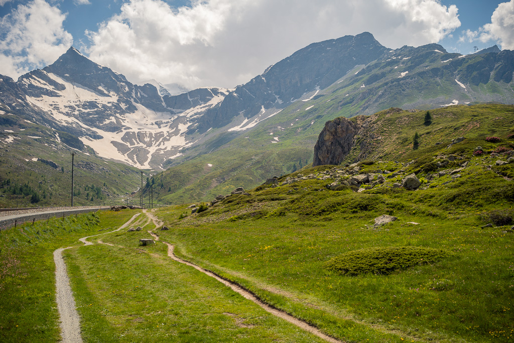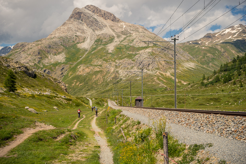 Den oberen Teil des Trails vom Bernina-Hospiz bis zur Staumauer des Lago Bianco hatten wir neulich schon zu Fuss begangen und ich wusste, dass er sehr verblockt war. Ich fuhr daher zunächst auf der Strasse wieder zum Hospiz hinunter und kurz danach auf einem Zufahrtsweg direkt zur Staumauer. Ab hier war der Trail für mich leichter befahrbar und ein wahres, wenn auch auf kurzen Abschnitten holpriges Vergnügen. In der weiten Flussebene der Ova da Bernina bis Lagalb und Diavolezza kam ich zügig vorwärts und musste das Bike nur an einzelnen verblockten steilen Stellen kurz hinuntertragen. Zum grössten Teil war der Weg aber ein Schotter- und Singletrail mit flachem Gefälle und führte dem rauschenden Bach und der Zuglinie in einiger Entfernung von der Passstrasse entlang.