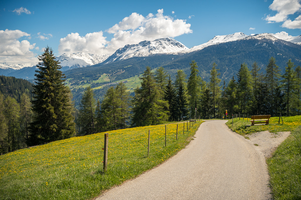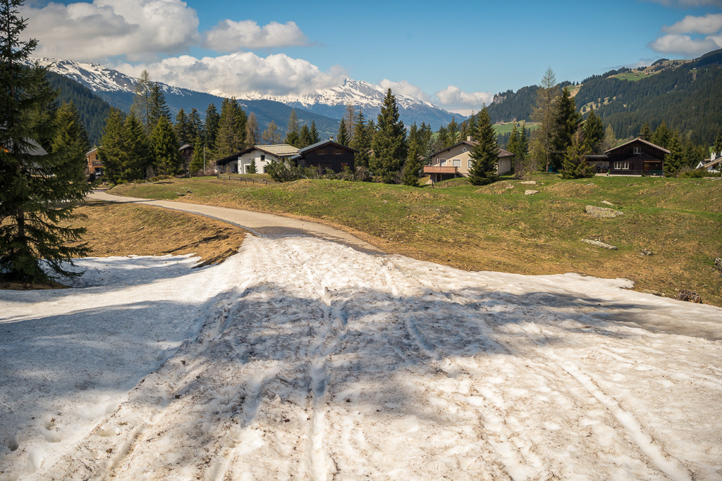 Geplant war eigentlich eine einfache Fahrt über die Lenzerheide nach Chur auf den Wald- und Feldwegen zwischen Valbella, Parpan und Churwalden, die bei meiner letzten Fahrt noch schneebedeckt gewesen waren. Diesmal war inzwischen auf der Strecke (fast) alles schneefrei. Bei der Ankunft in Churwalden überkam mich jedoch ein spontaner Widerwillen, weiter hinunter in die Stadt zu fahren (vermutlich ein Anfall von Zivilisationskoller?), sodass ich kehrt machte und auf der Strasse von Churwalden wieder nach Parpan und Valbella hochkurbelte.