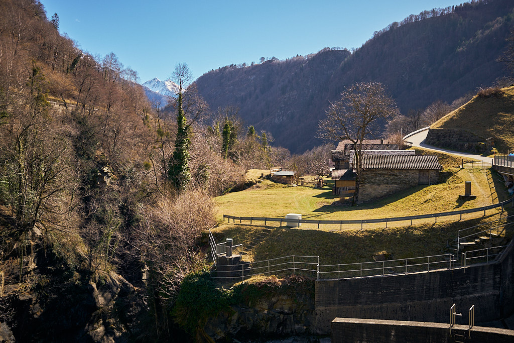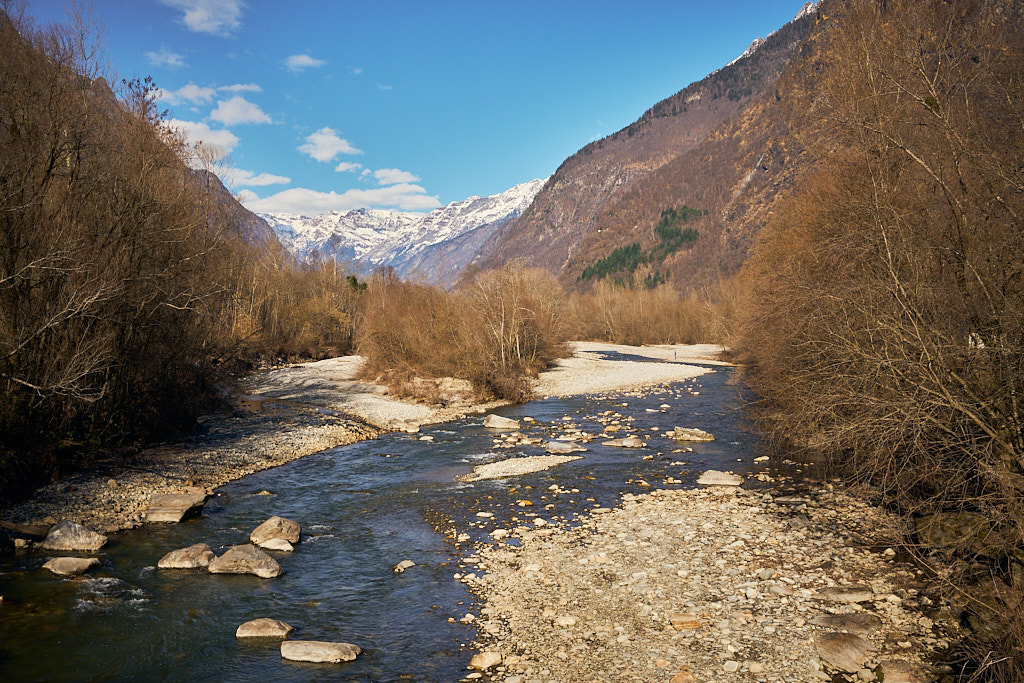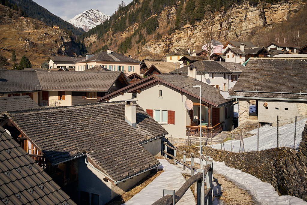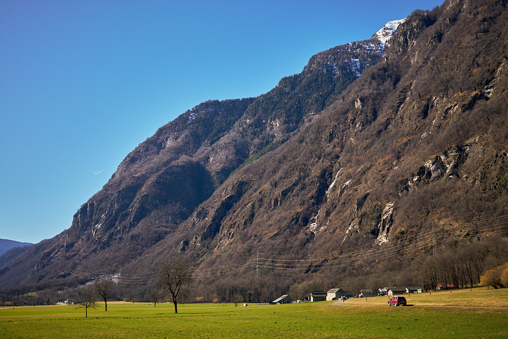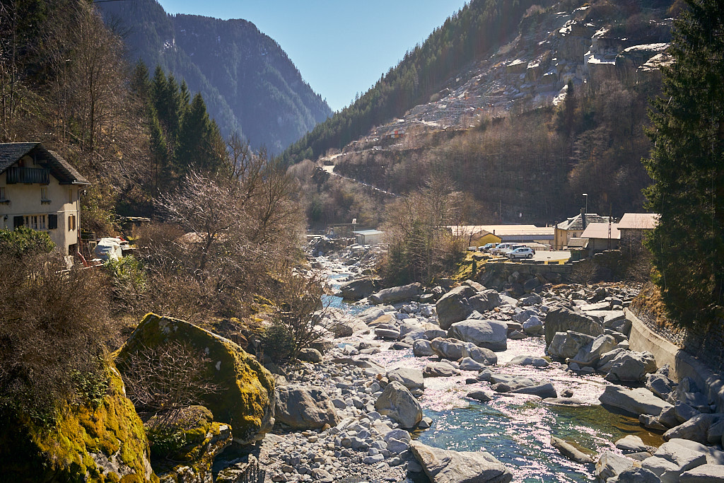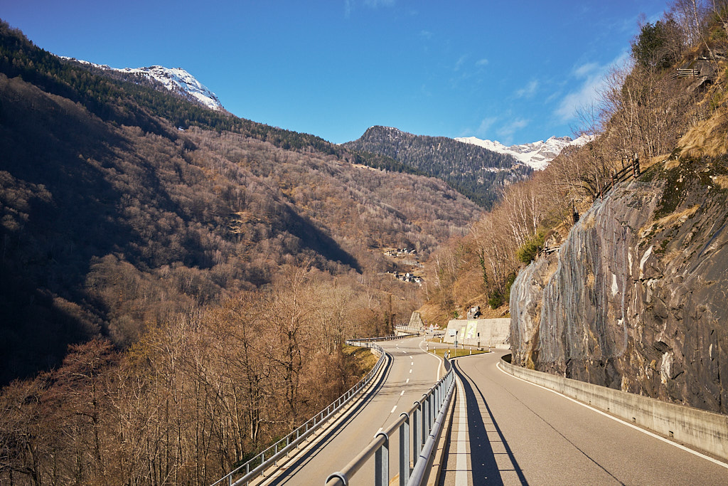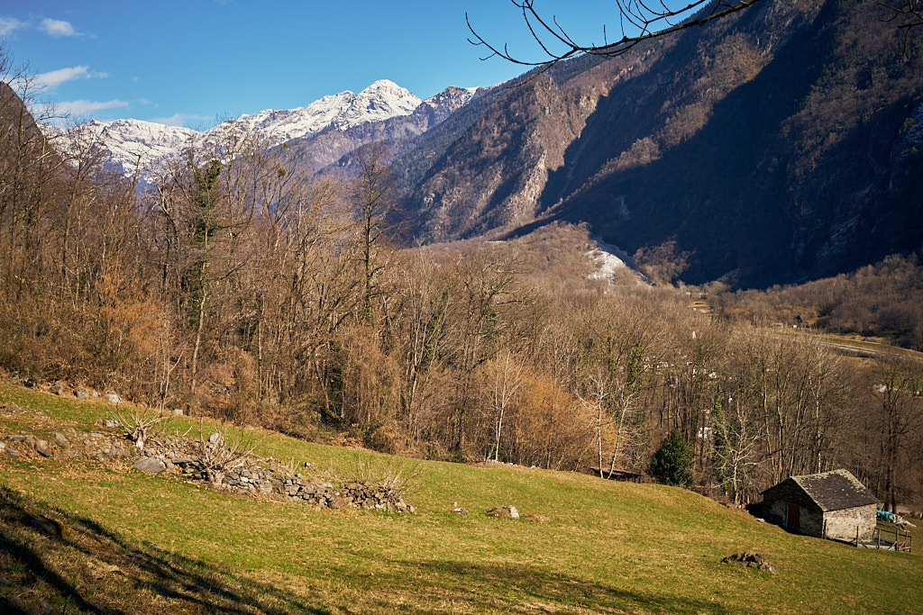Von hier aus fuhr ich nun weiter in den mir unbekannten Teil des Calancatals. Das Tal war schneefrei, die Sonne schien, es hatte fast keinen Verkehr und die Fahrt entlang des Flusses Calancasca war dementsprechend entspannt und meditativ. Bald erreichte ich das nächste Dorf Arvigo, von wo aus eine kleine Seilbahn gerade nach Braggio hinauffuhr. Braggio ist offenbar auch über eine Strasse erreichbar und wäre bei weniger Schnee sicher auch einen Besuch mit dem Bike wert.