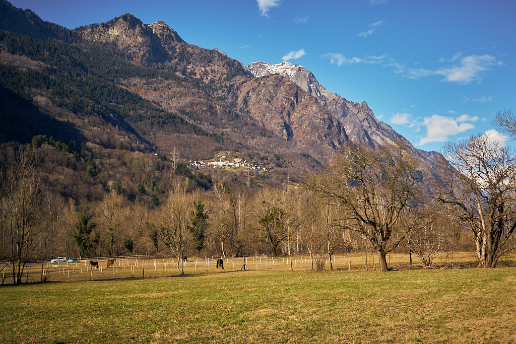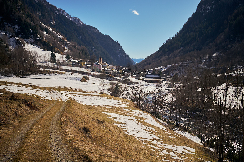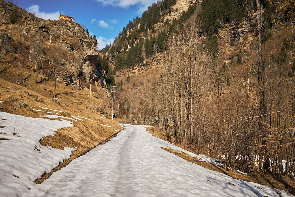 Von Rossa aus würde ein asphaltierter Fahrweg noch weiter ins Tal zum Weiler Valbella führen. Dahinter gab es offenbar noch einen Feldweg, der 2km weiter in den Talschluss nach La Motta führte, wo man dann definitiv nur noch auf Wanderwegen zu verschiedenen umliegenden Gipfeln gelangen könnte. Das alles war allerdings nur graue (bzw. weisse) Theorie: schon am Dorfausgang von Rossa war der Weg nach Valbella mit einer dicken, unverspurten Schneedecke überzogen. Für heute musste der Vorstoss daher an dieser Stelle enden.