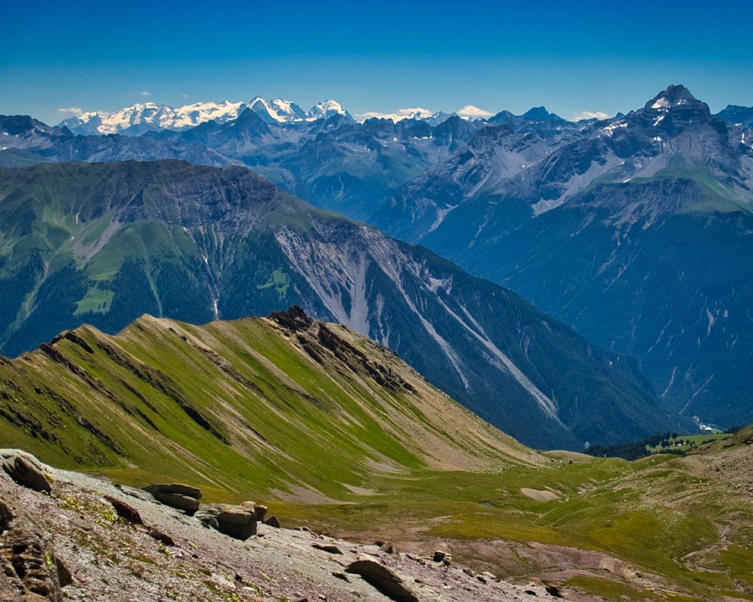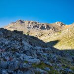 Vom Gipfel nach Westen über die anfangs steil abwärtsgeschichteten Platten in die Einsenkung hinunter, wo die Geröllfelder den Grat erreichen. Am besten die ersten paar Meter möglichst hoch an der Gratkante halten, bis ein etwa 30cm breiter, schräg abwärts führender Riss im Fels für die nächsten paar Meter vom Abstieg missbraucht werden kann. Dann auf erdigen Trittpolstern in leichteres Gelände bzw. ins Geröll queren. Den direkten Weg von der Alp Martrüel bis hierhin habe ich bereits hier beschrieben.