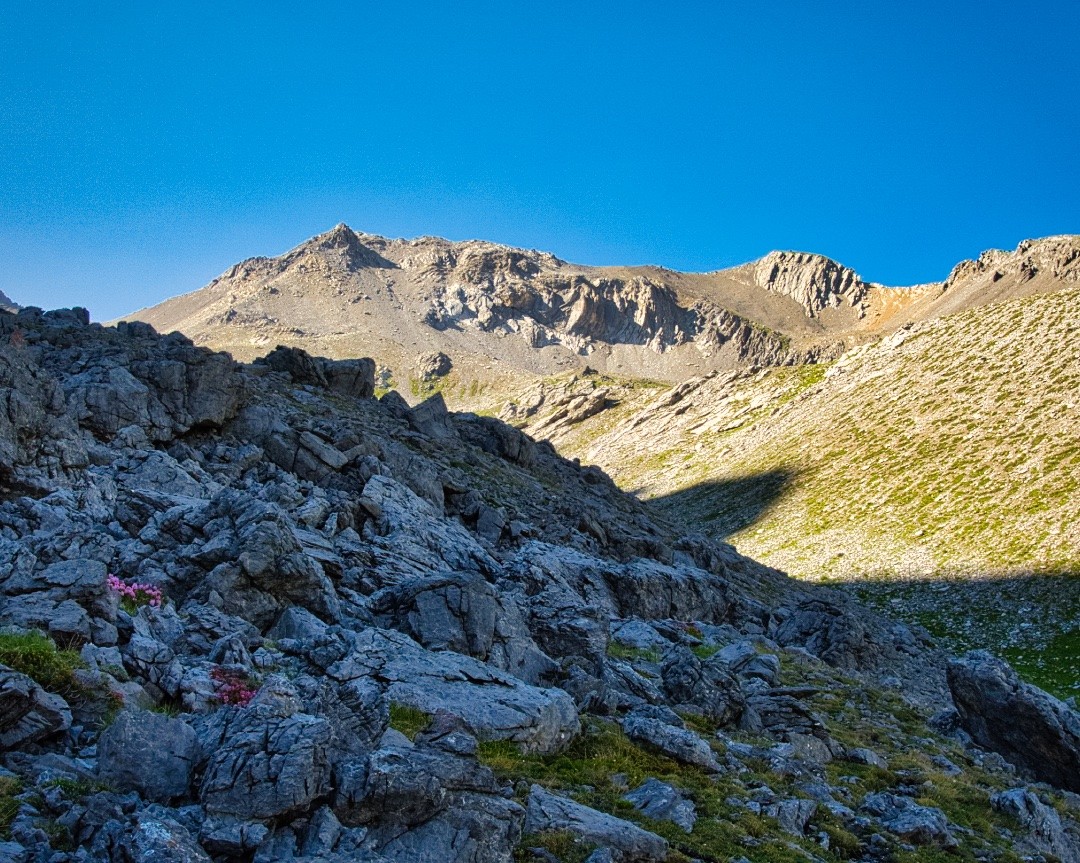 Weiterer Aufstieg über einen Grasrücken an den Fuss vom Gipfelaufbau des Spitzig Gretli Ostgipfels (P. 2788). Etwas nach links (Süden) traversieren und über schräg geneigte Felsleisten, -vorsprünge und -bänder klettern, um den Aufbau im Zickzack tendenziell rechts hinauf zu überwinden.