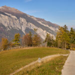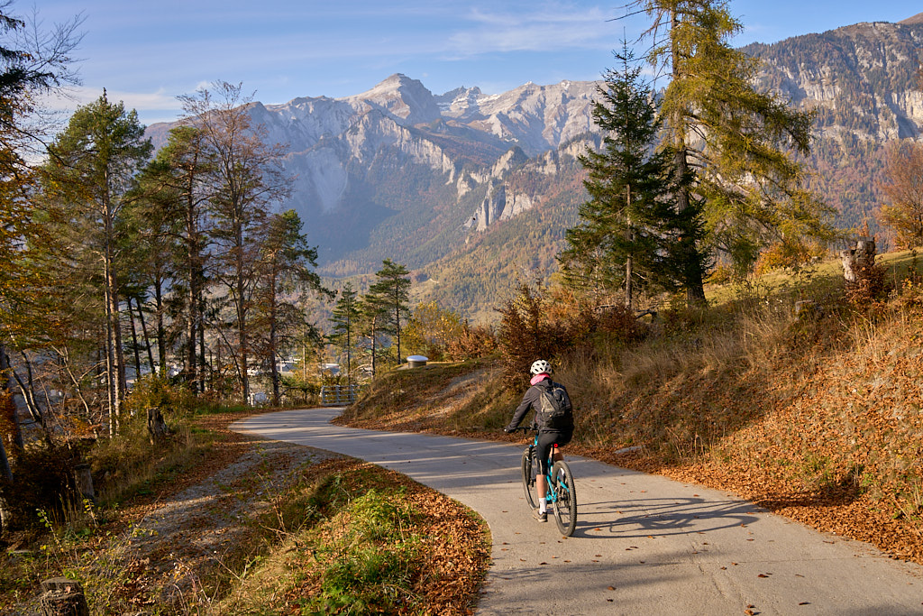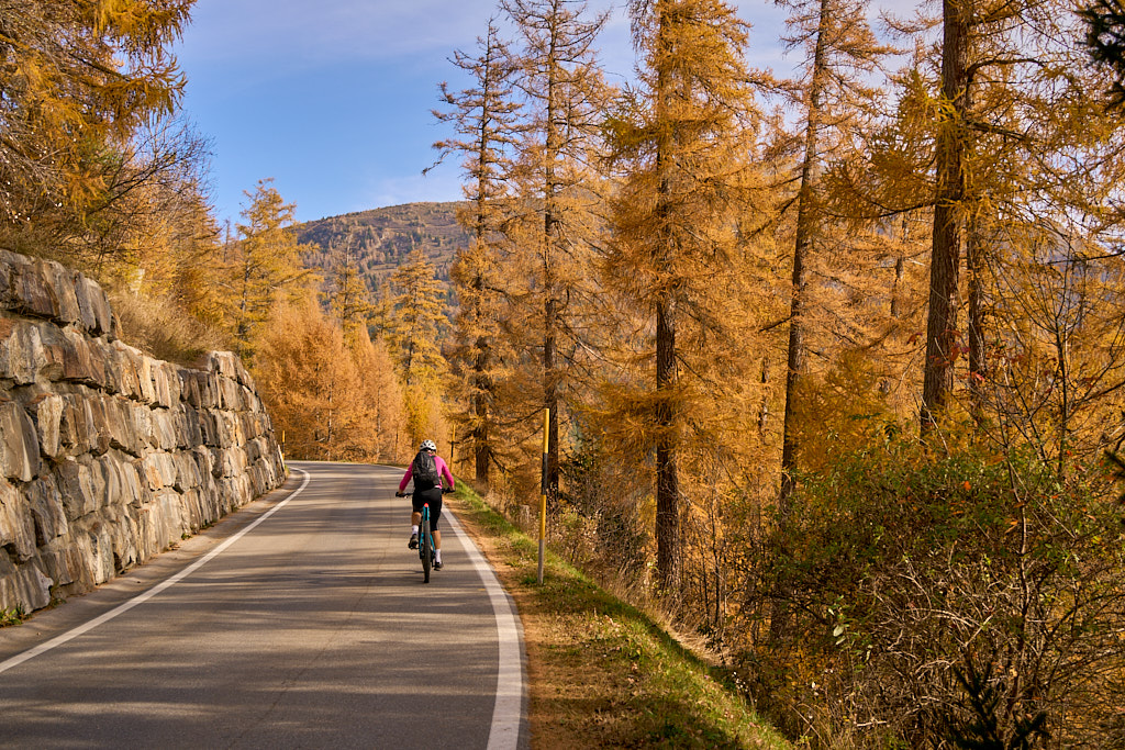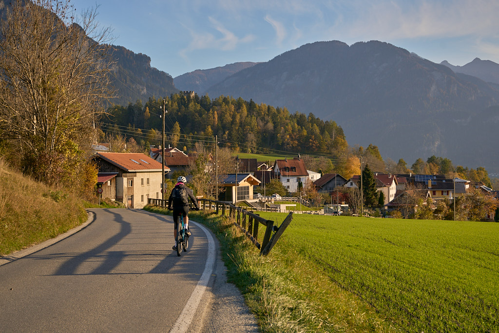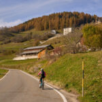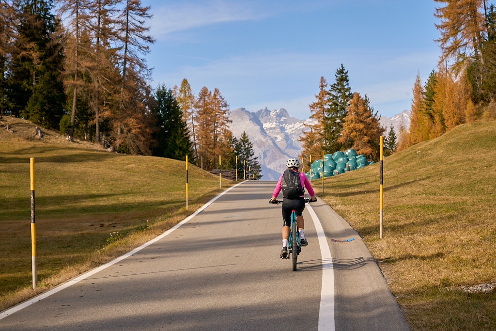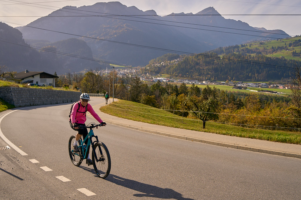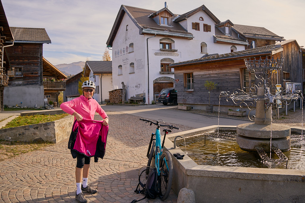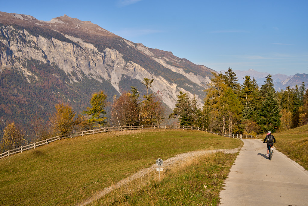 In Tomils begann der lange Aufstieg in vielen Schleifen nach Feldis. Während dies im Sommer eine schweisstreibende Etappe ist, wurde uns jetzt gerade einmal angenehm warm beim Fahren. Über dem Dorf Scheid auf halber Höhe erreichten wir Lärchenwälder, die immer noch gelb leuchteten und bei denen noch nicht alle Nadeln abgefallen waren. Wenig später kamen wir zum höchsten Punkt der Tour und erblickten erstmals Feldis vor dem eindrücklichen Panorama der Ringelspitzkette, die wir neulich von Bad Ragaz aus vergeblich gesucht hatten.